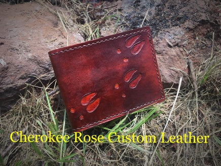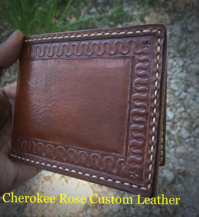 This custom leather bifold wallet is made from high quality vegetable tanned leather that is hand stamped and then hand dyed to your specific color choice. I have an assortment of specialized stamps and a few different fonts for you to choose from to create the perfect wallet just for you or for the gift recipient.