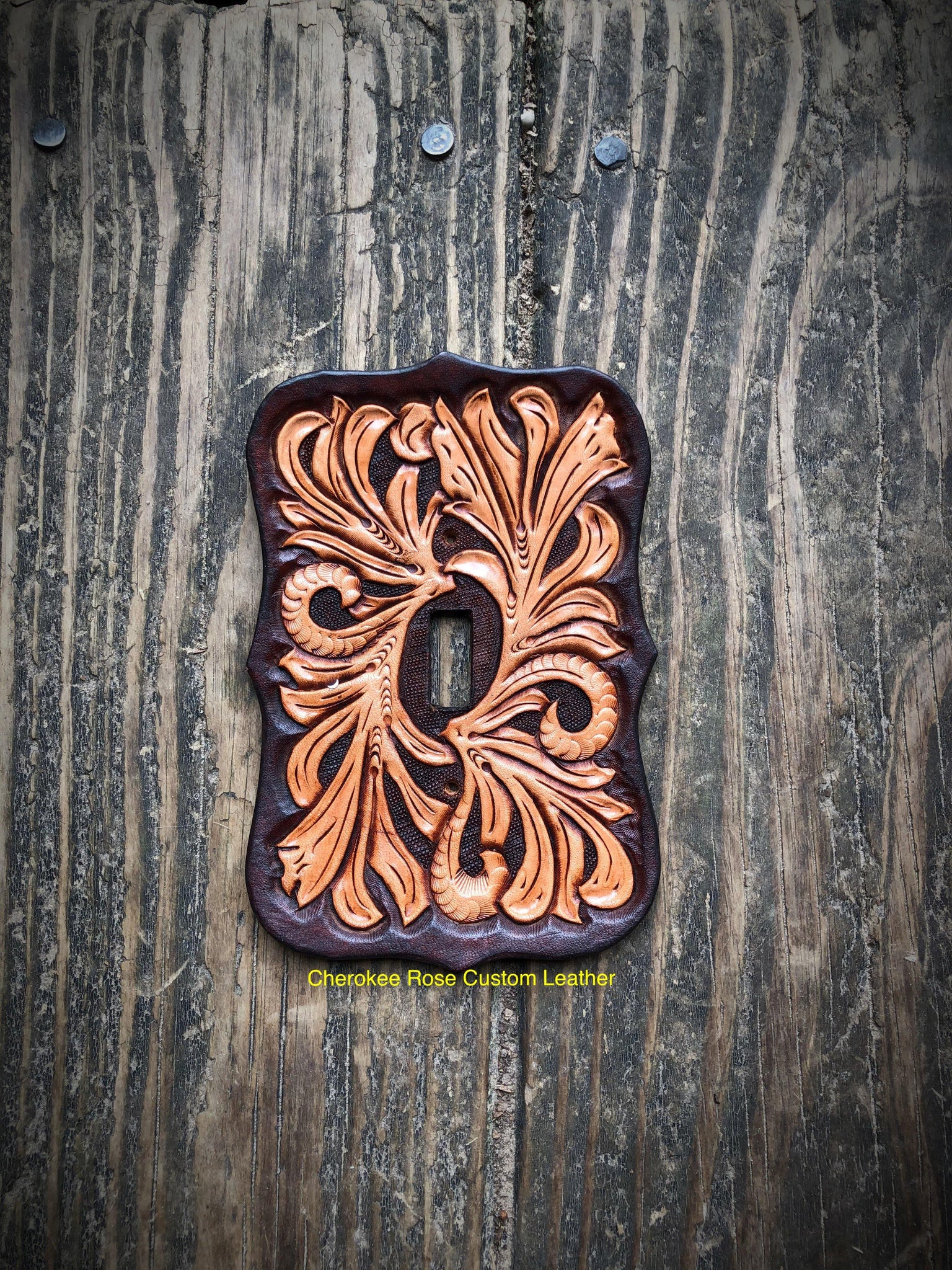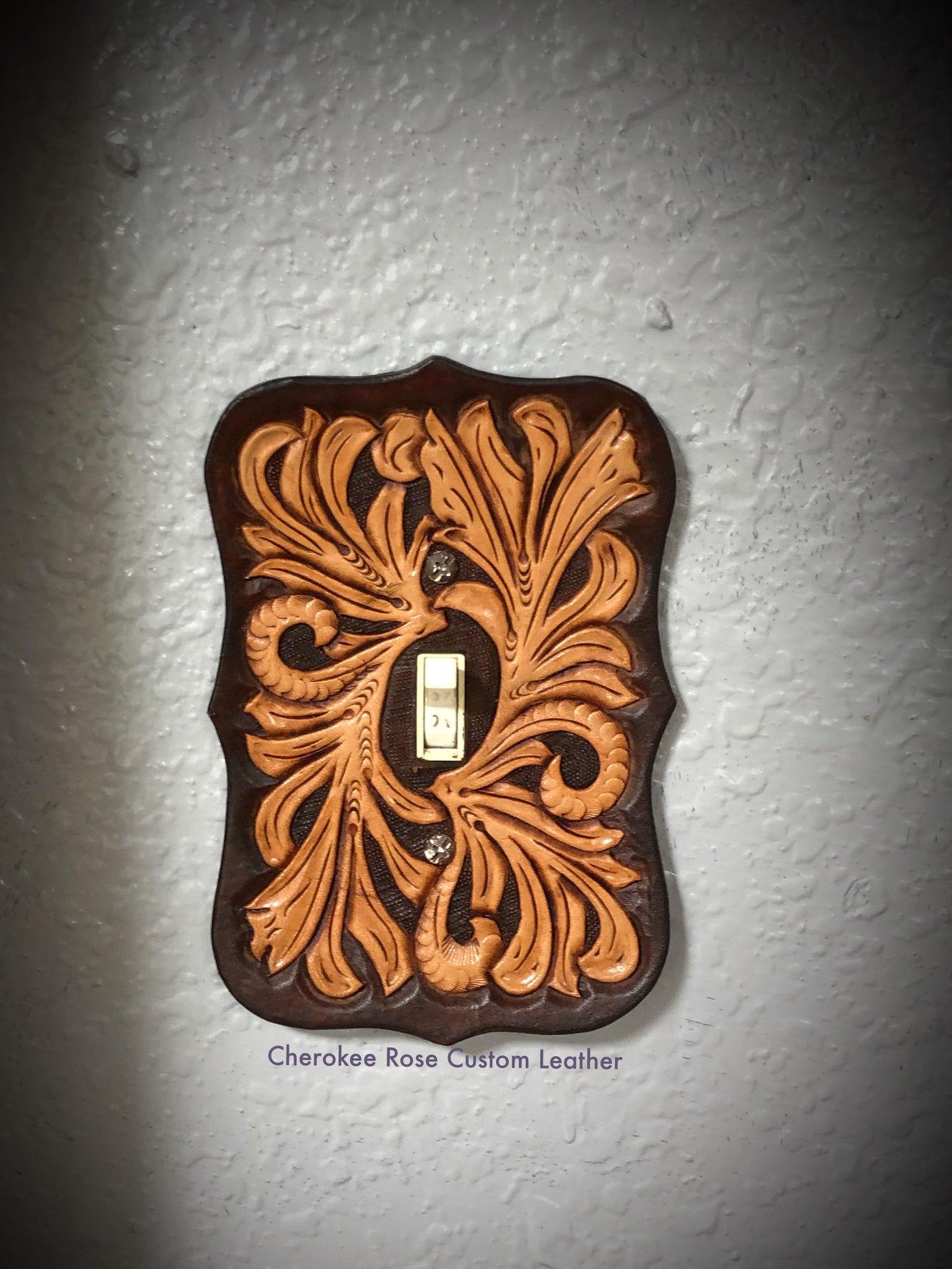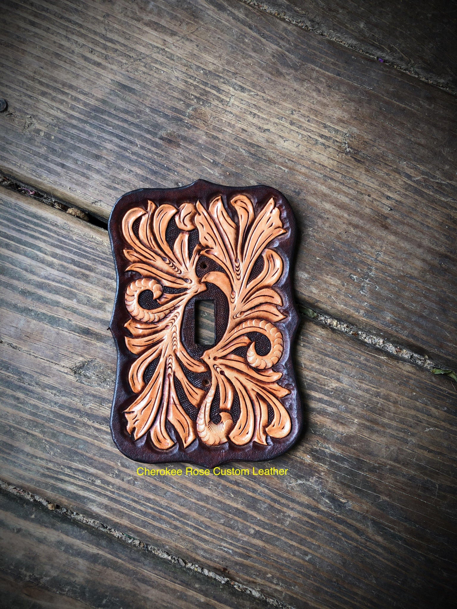 This one I created in a more traditional color and design. Featuring hand carved traditional floral pattern with a hand dyed background and antiqued with Sheridan brown to really make the decorative cuts and tooling really pop and stand out.