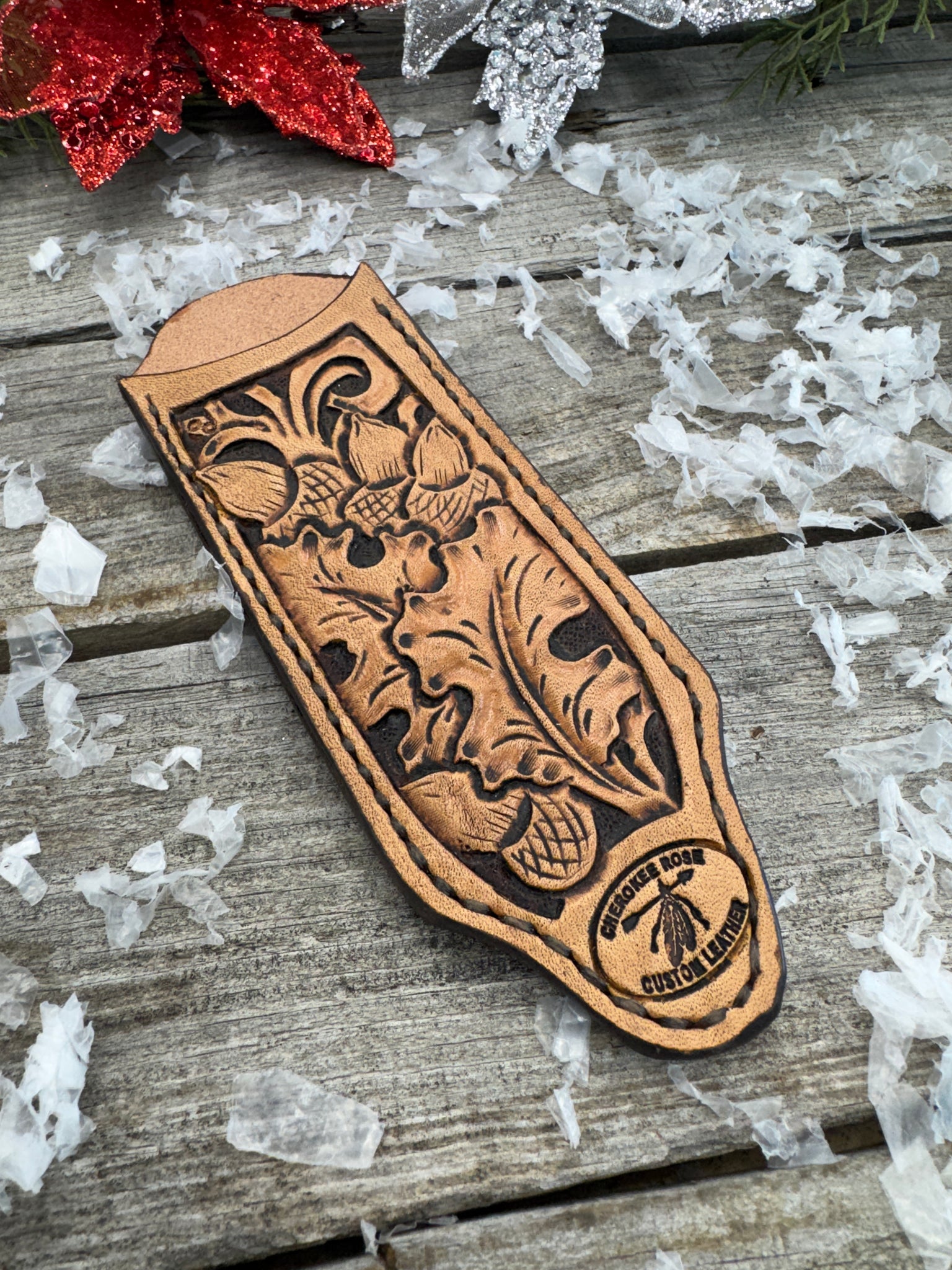 Crafted from 6/7 oz vegetable-tanned cowhide, this piece is hand carved and tooled with a traditional oak leaf and acorn motif — a timeless symbol of strength and growth. The soft tan dye highlights the natural beauty of the leather, while the dark background adds depth and contrast to each tooled detail.