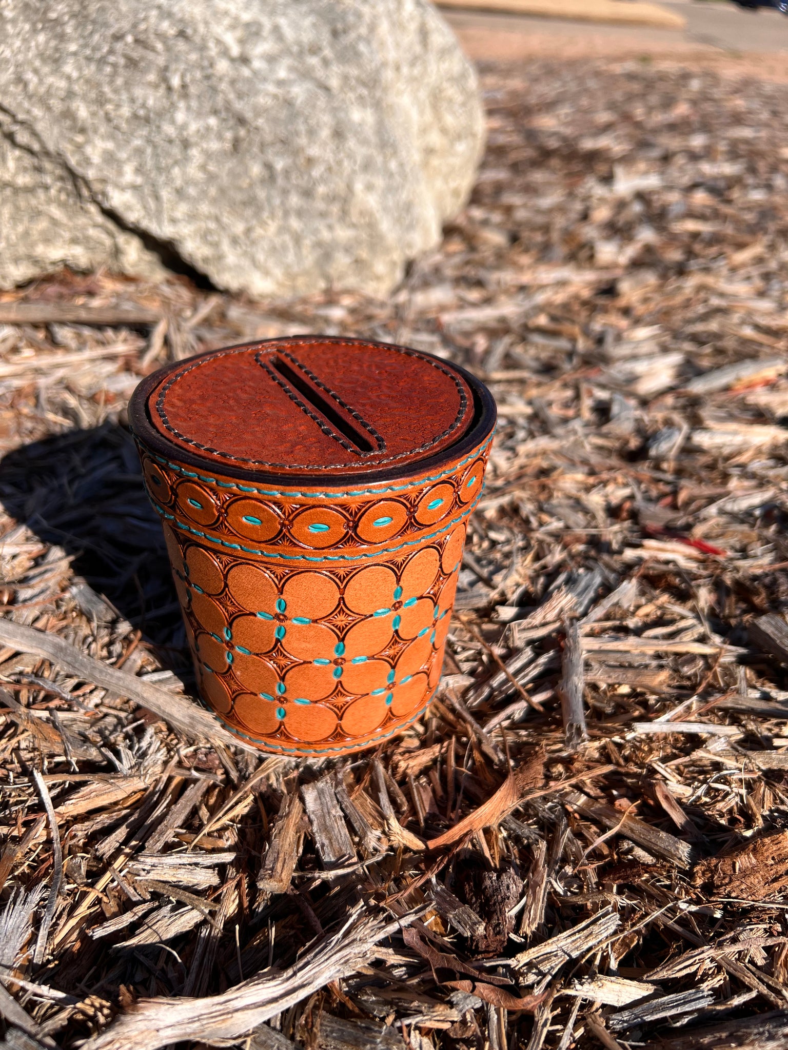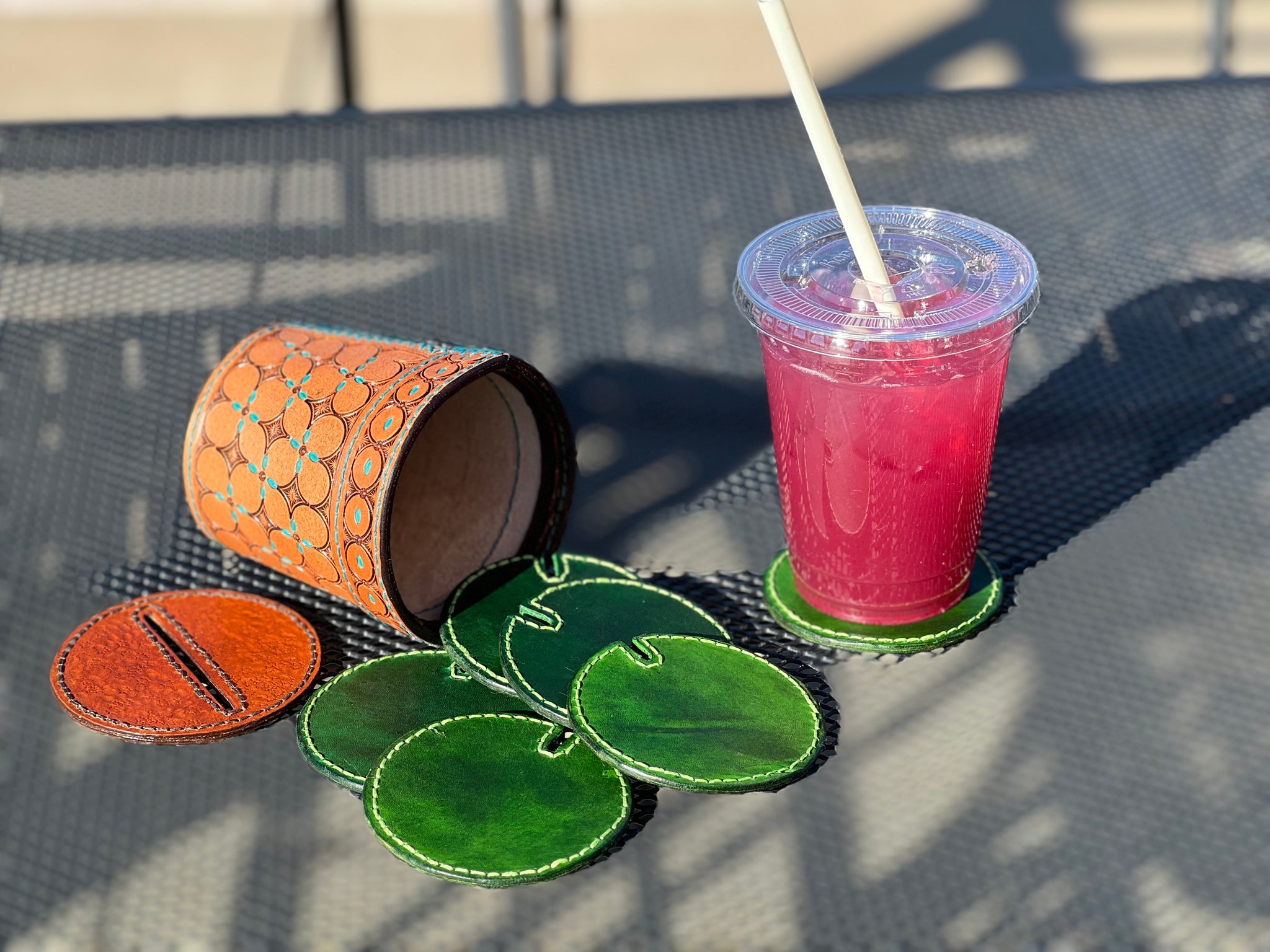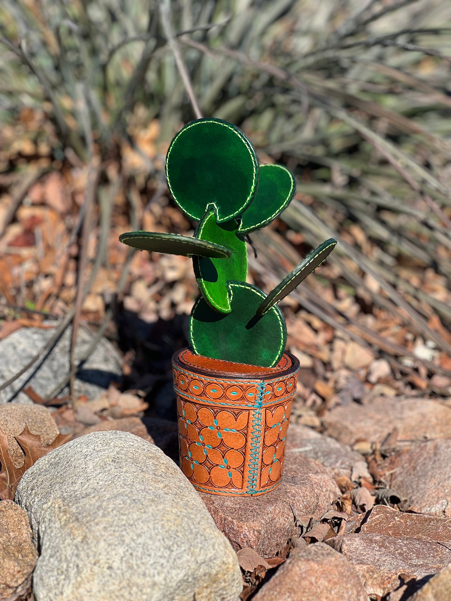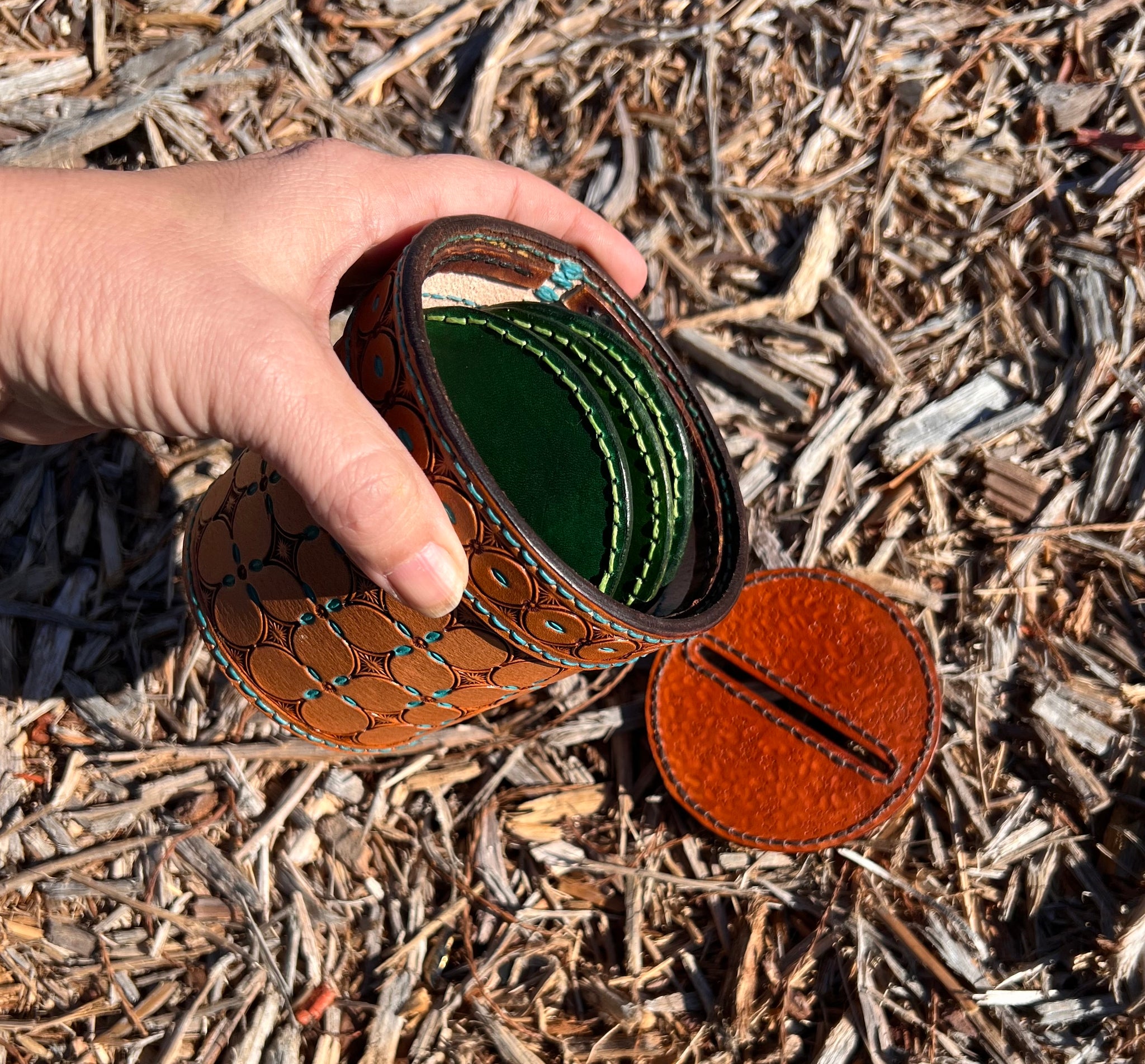 Experience the cuteness of our leather cactus coaster gift set! Crafted with love from vegetable tanned leather, this set includes six (6) 3 inch coasters and a charming hand-stamped flower pot for storage and decoration. Our coasters are expertly stitched with vibrant matching green thread for a unique touch.