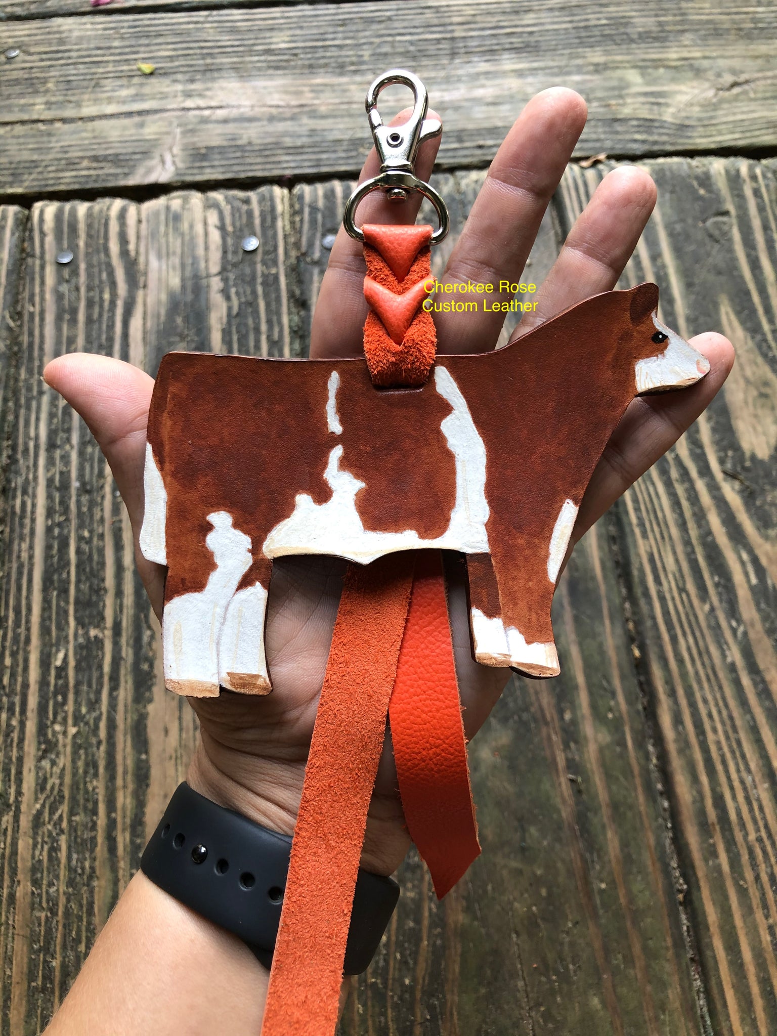 Comes with attached orange chap leather key chain with a hand tied blood knot and nickle swivel snap.
