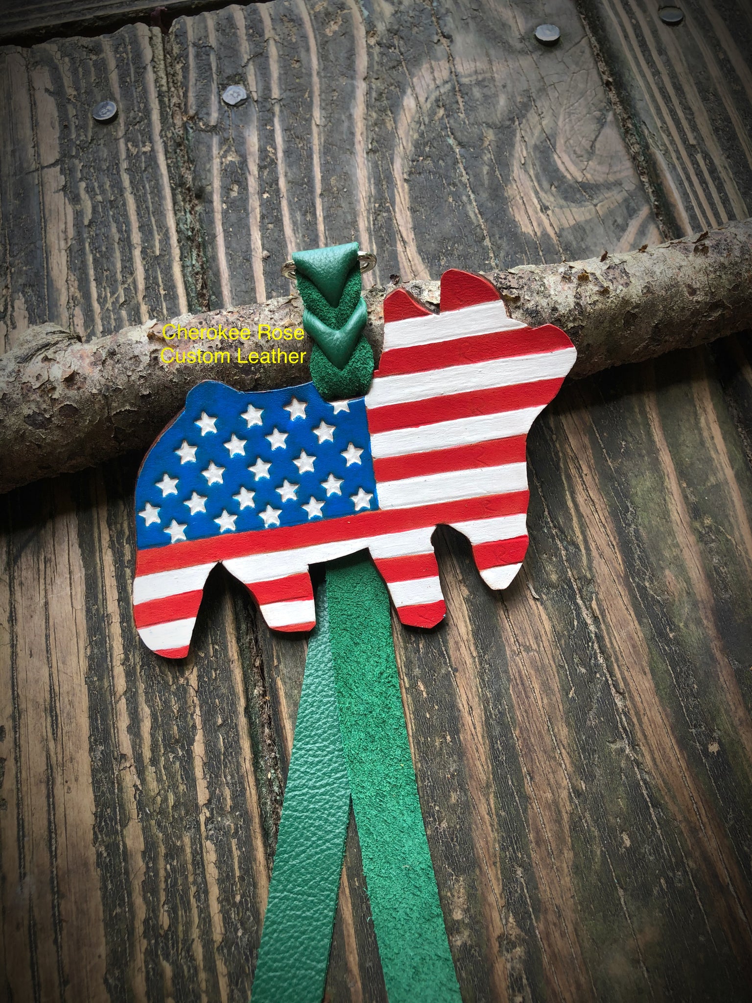 This sturdy keychain is hand painted with an iconic American flag show hog design to proudly display your love of the USA. Crafted from real leather, it will keep your keys safe and secure for years to come.