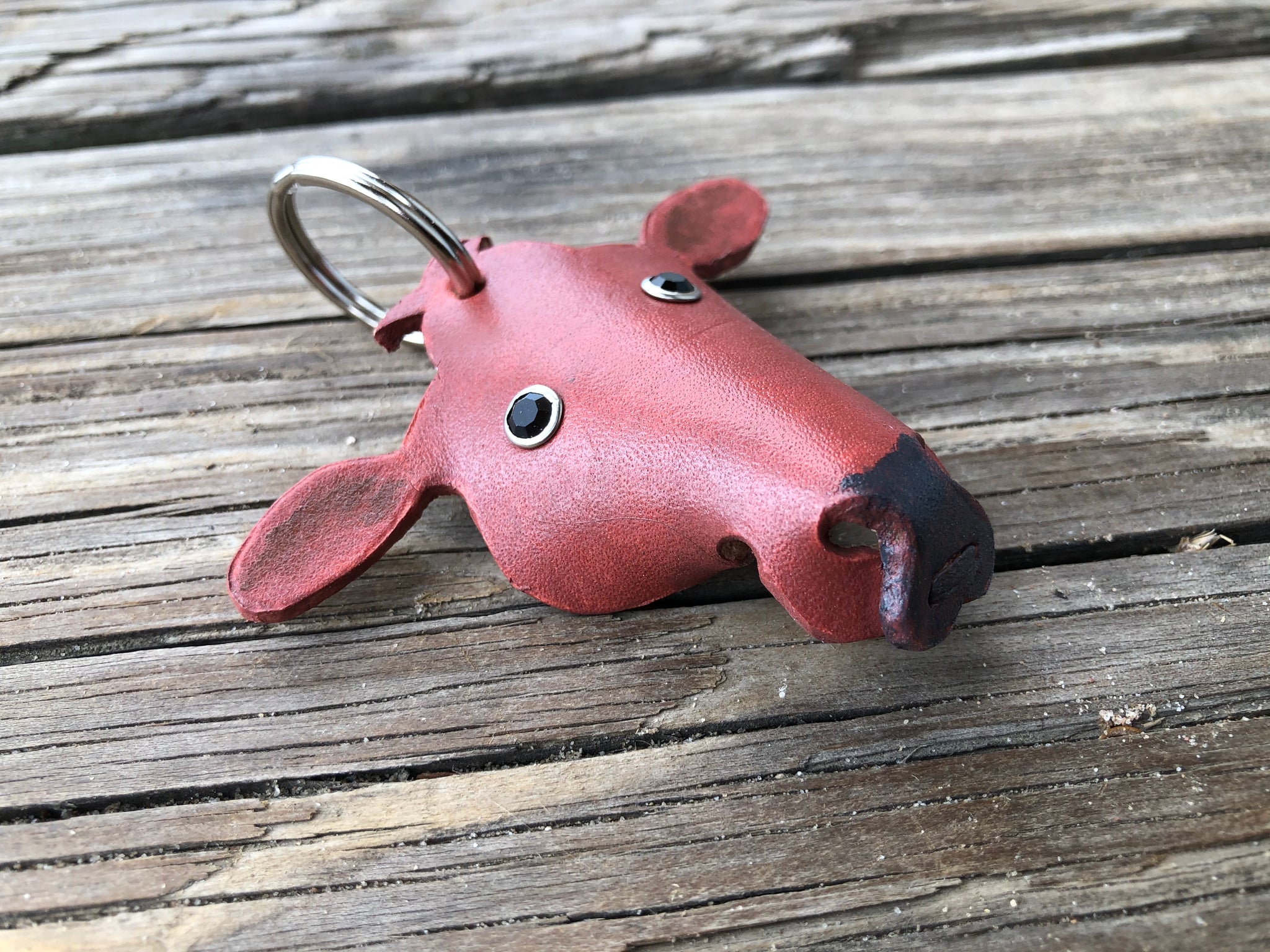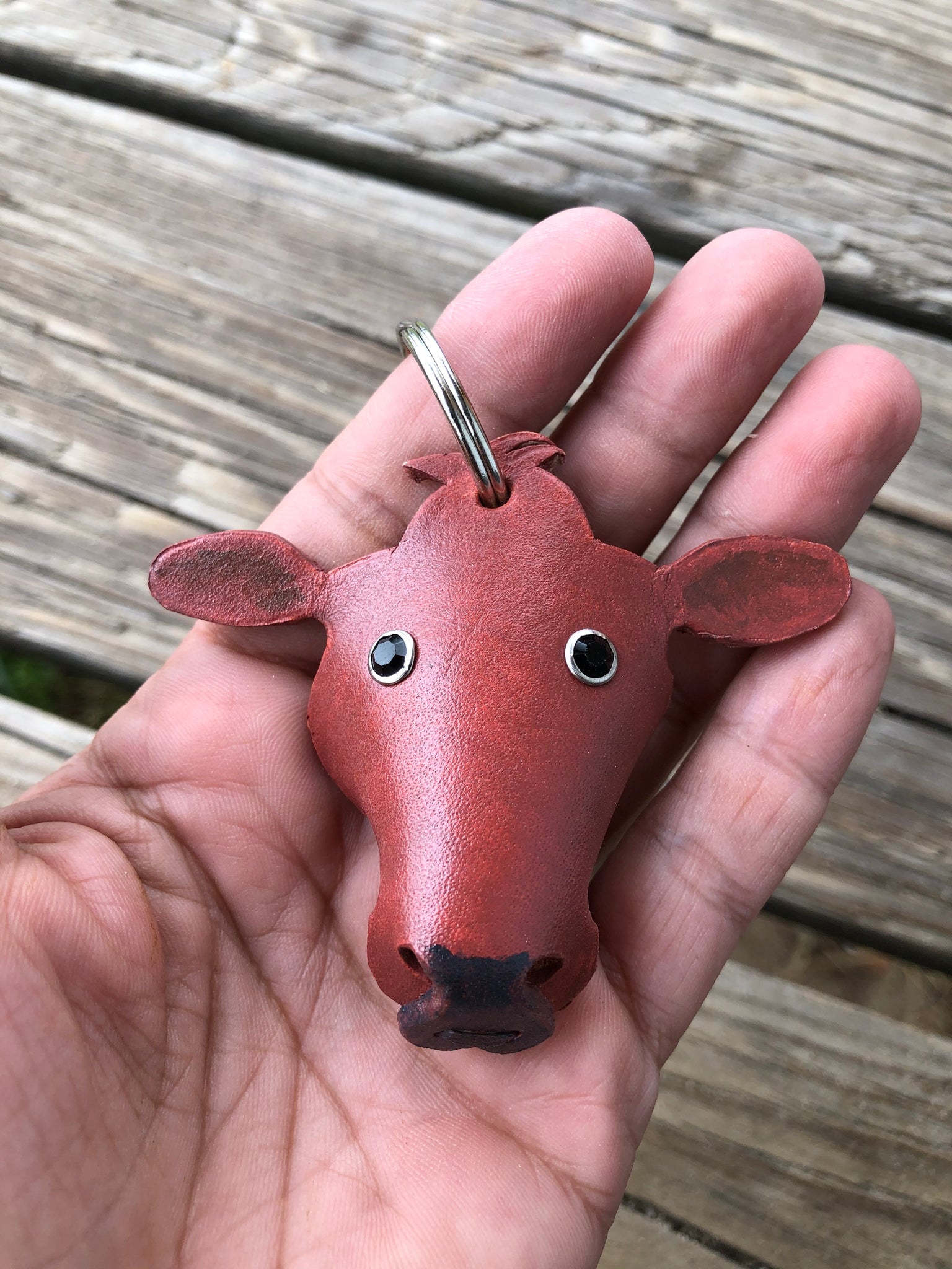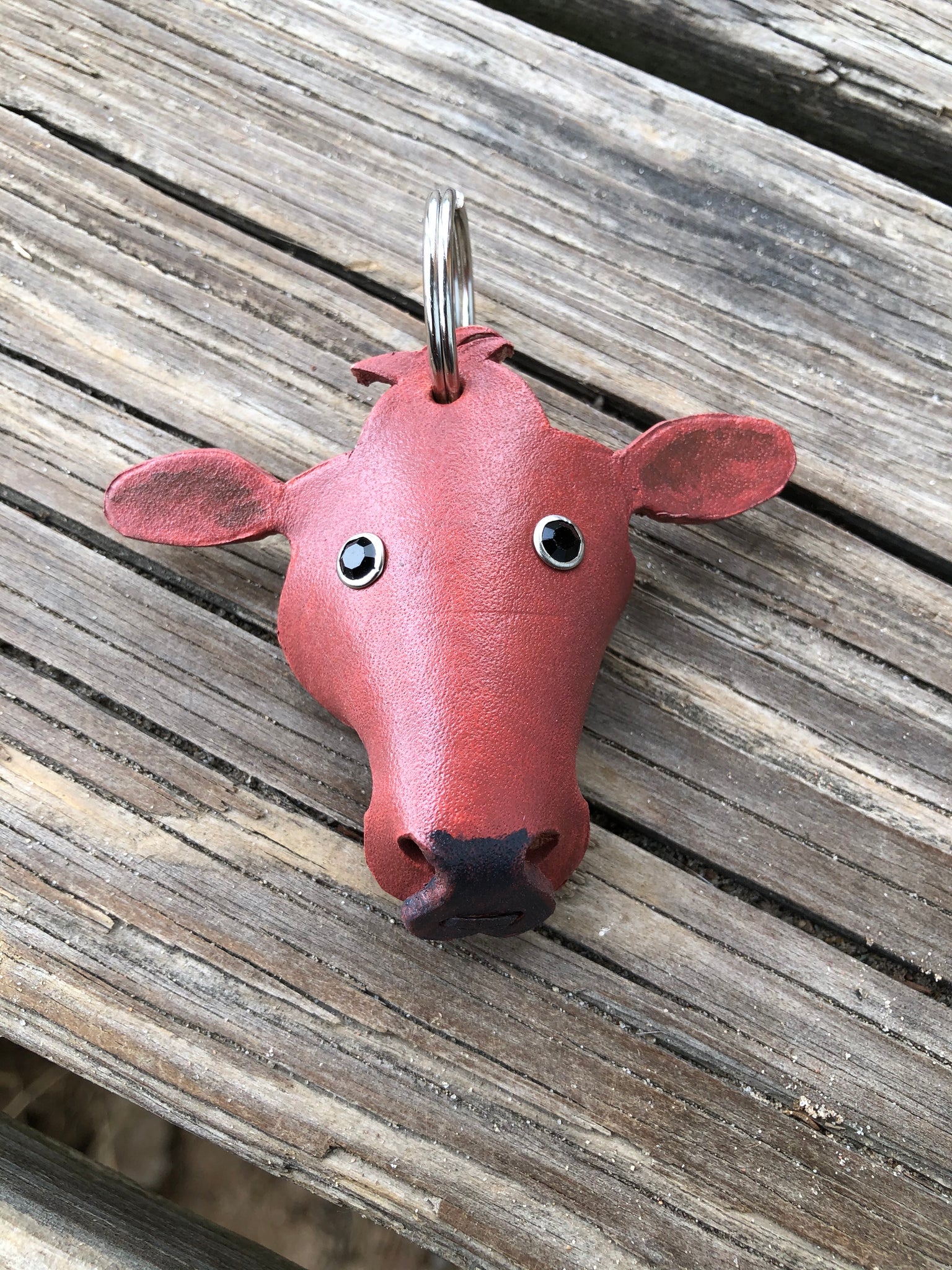 Our Red Angus cow leather key chain measures approx 3 inches across and is about 2 1/2 inches tall with out the key ring.