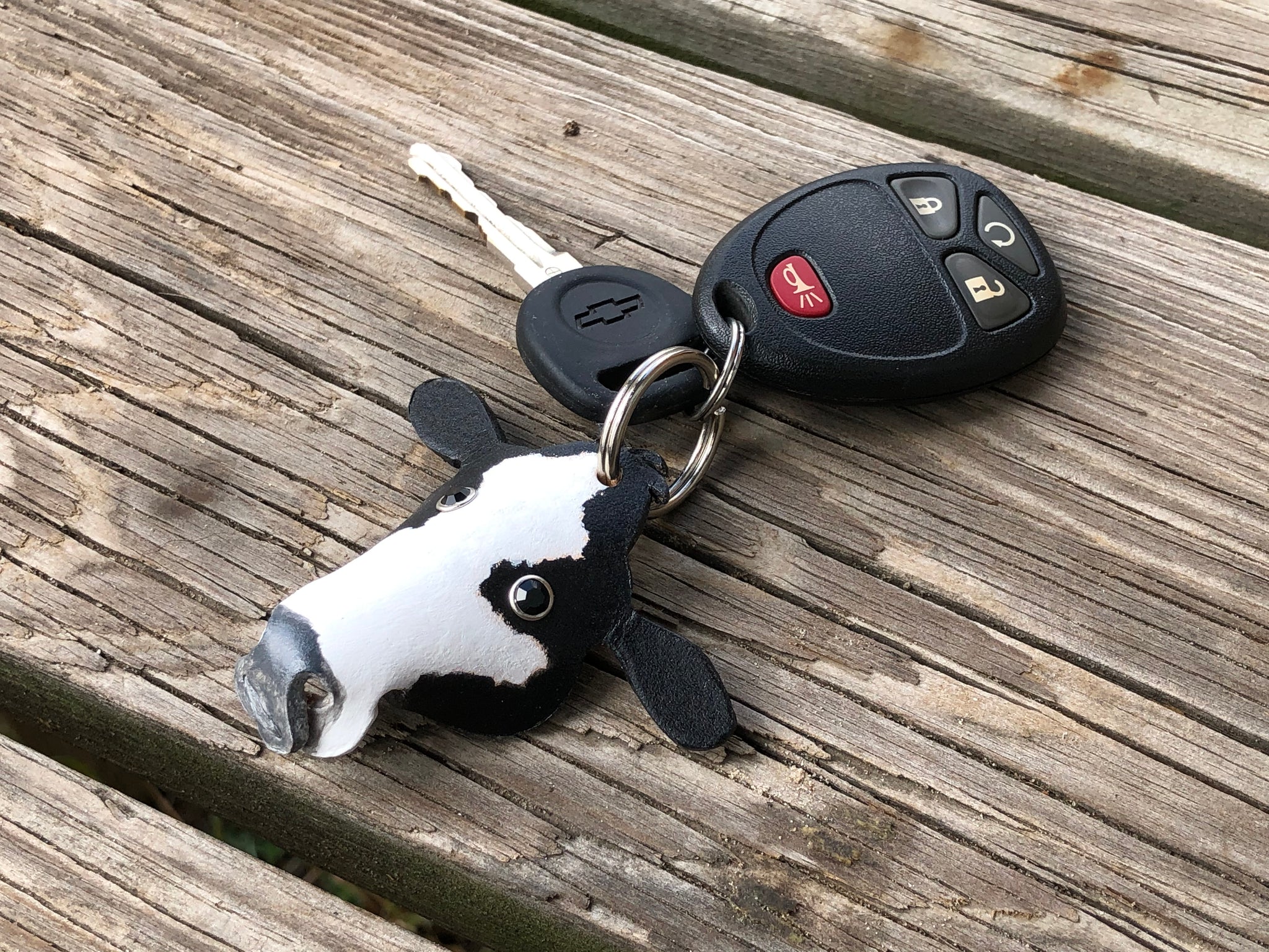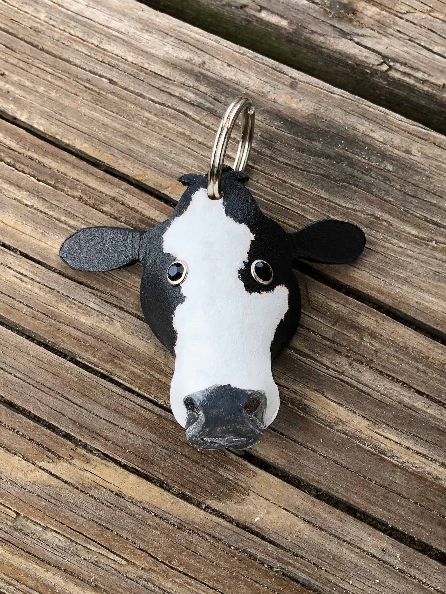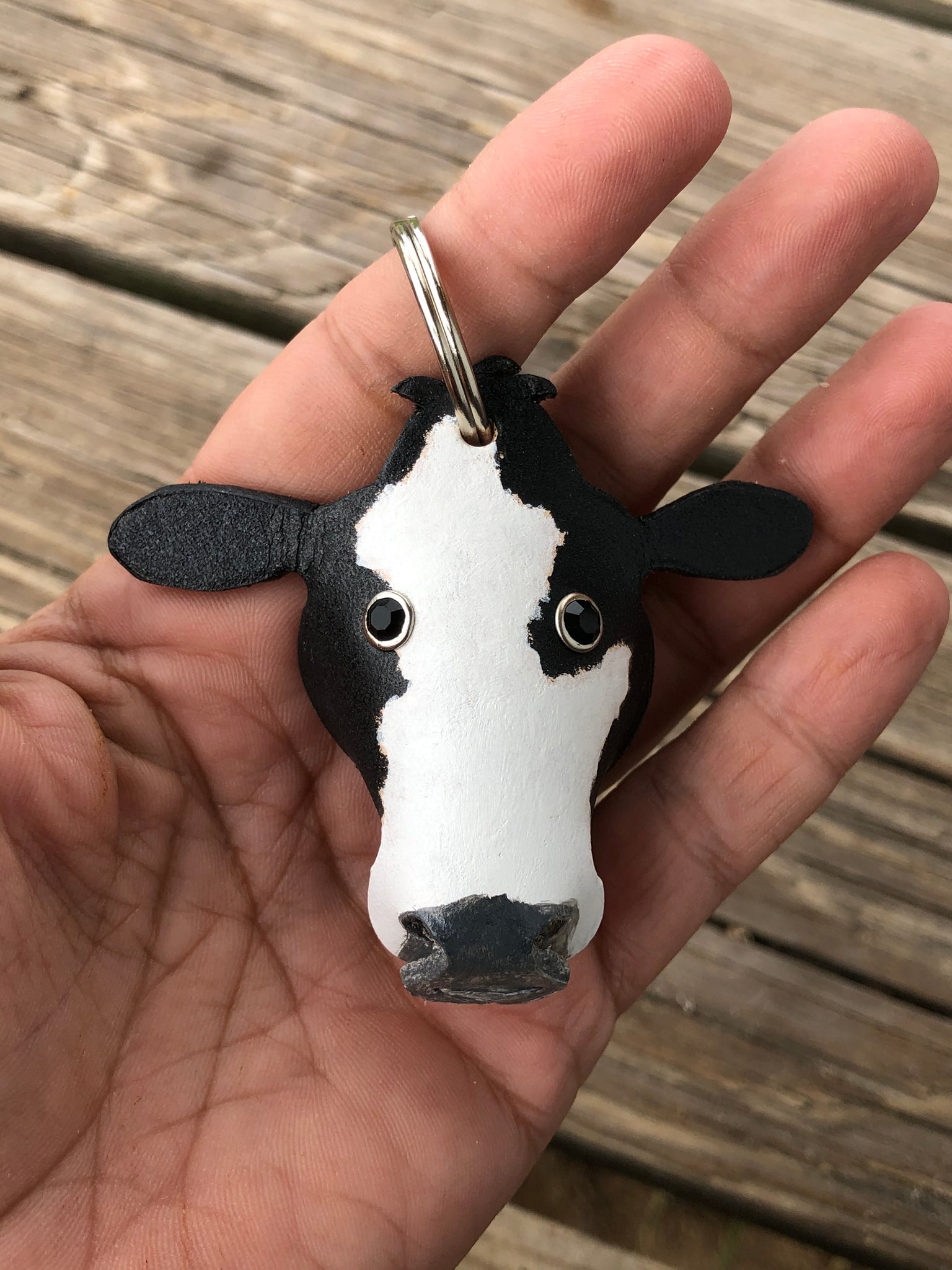 Our Simmental cow leather key chain measures approx 3 inches across and is about 2 1/2 inches tall with out the key ring.