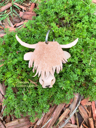 Our highland cow leather key chain measures approx 2 3/4 inches across and is about 2 1/4 inches tall with out the key ring.