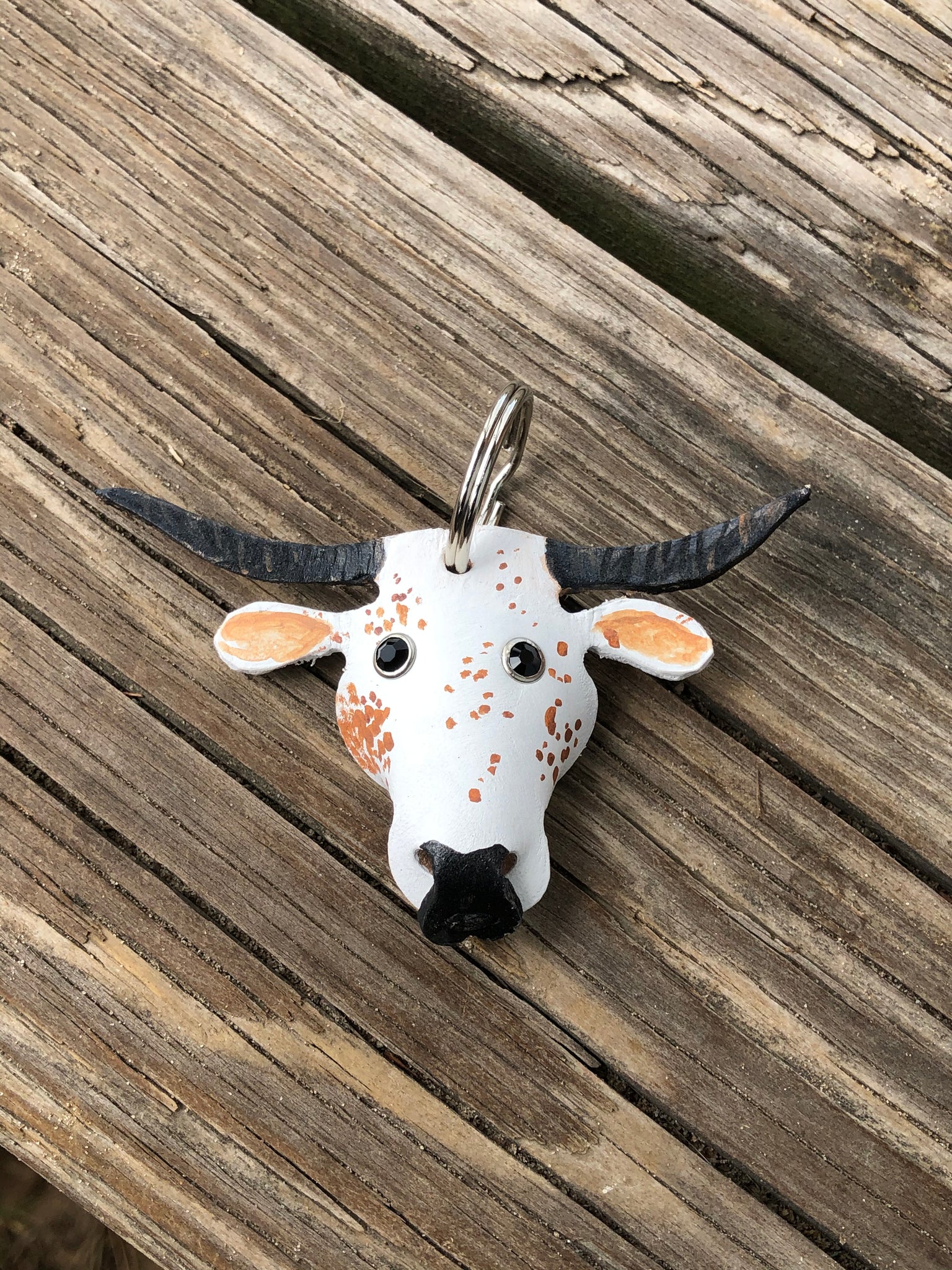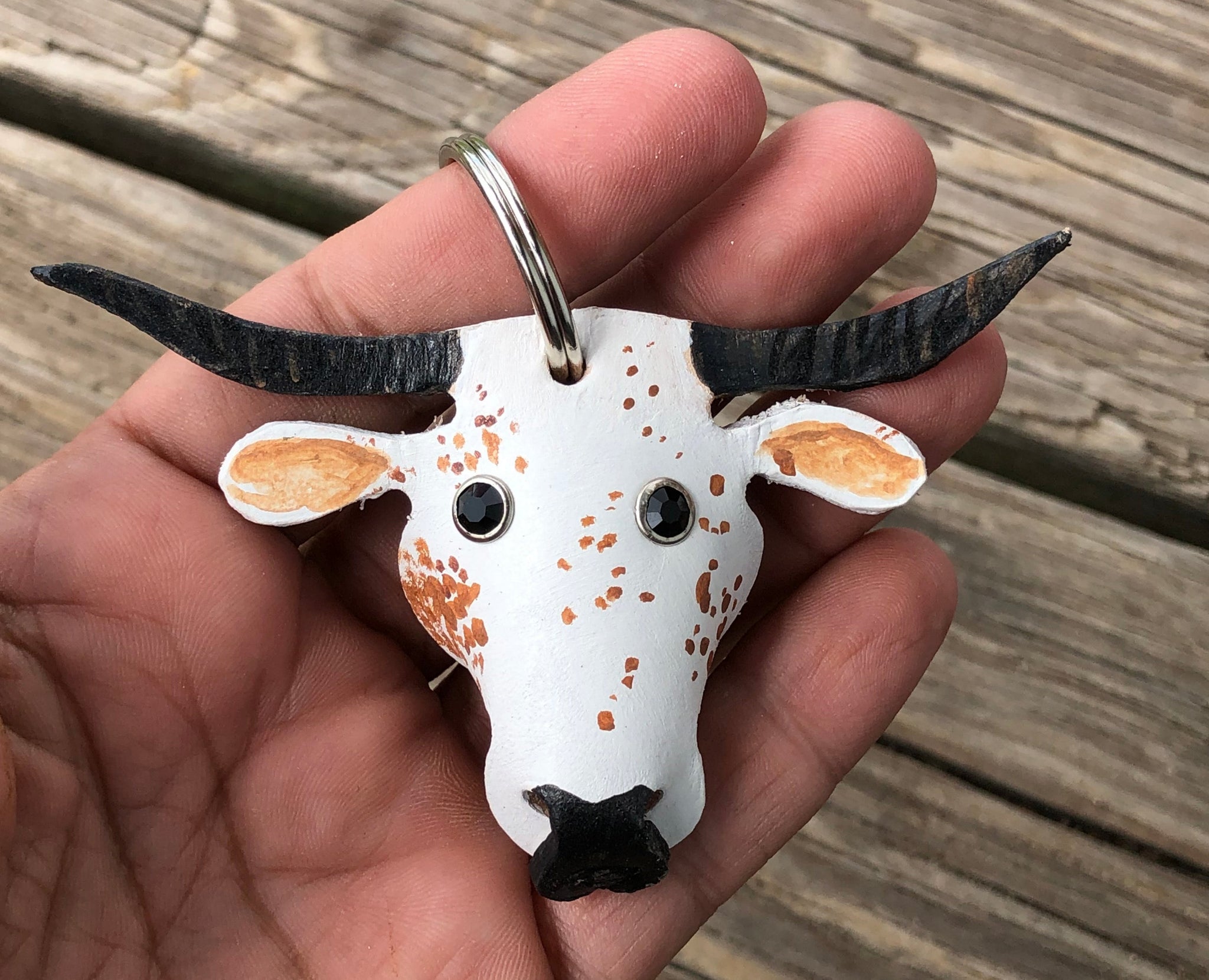 Our Longhorn leather key chain measures almost 4 inches across and is about 2 1/2 inches tall with out the key ring.