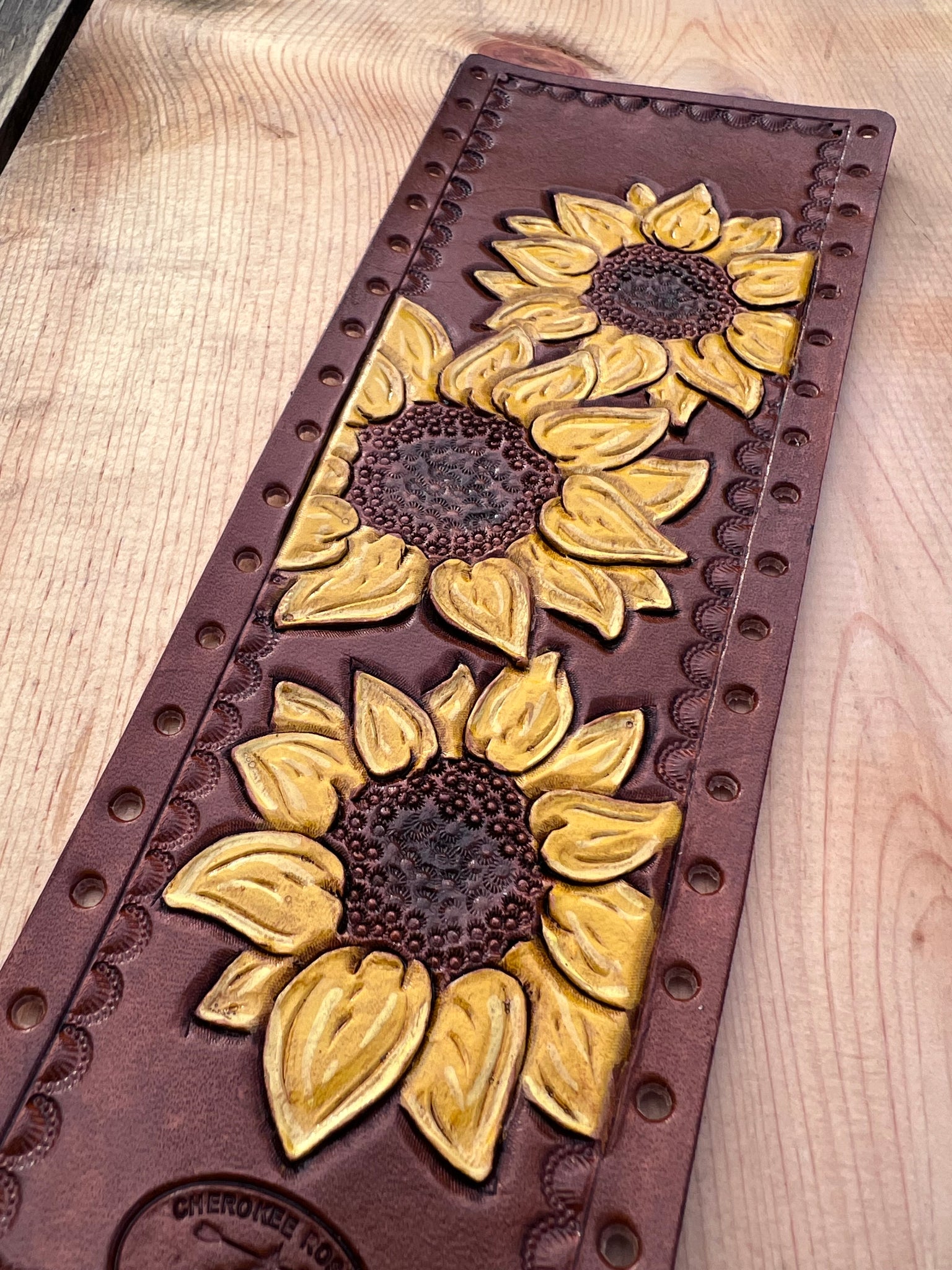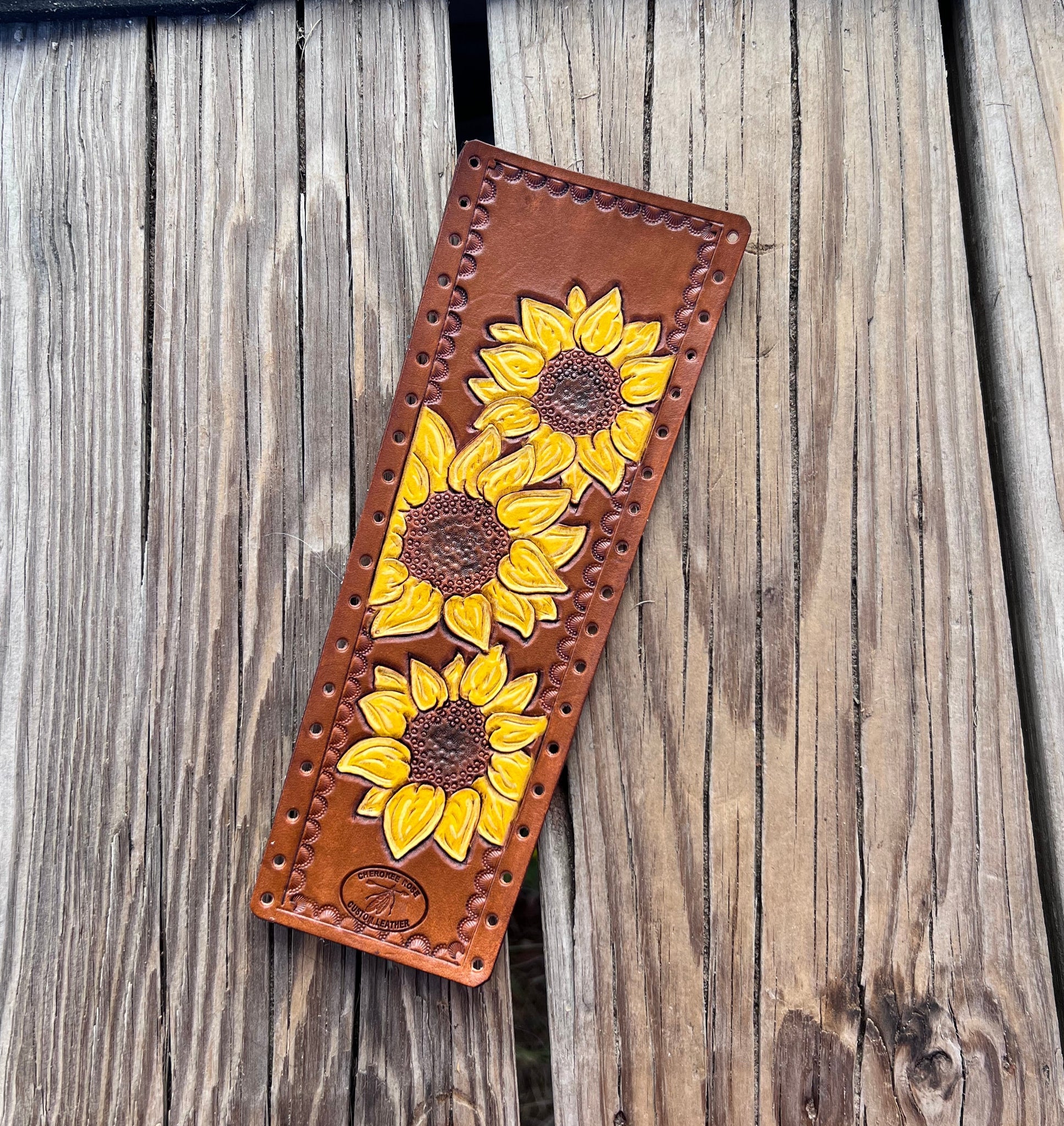 Show off your show stick in style with our Carved Sunflower Trio Leather Show Stick Wrap. Impress the judges with a trio of hand-carved and hand-painted sunflowers, set against a deep chestnut background on 100% real cowhide leather. Show off your sunflower spirit with this unique and stylish cattle show stick wrap.