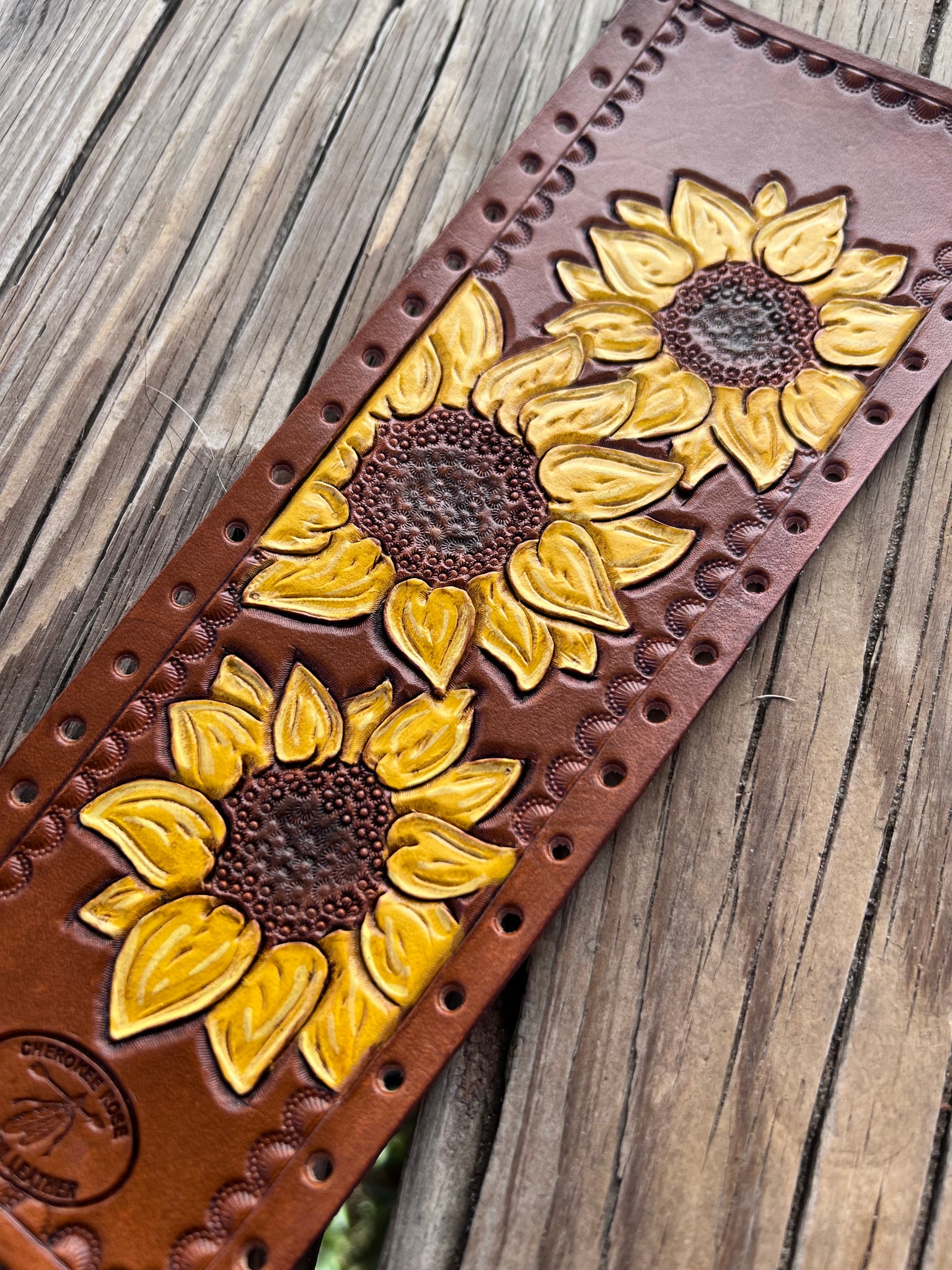 Carved Sunflower Trio Leather Show Stick Wrap