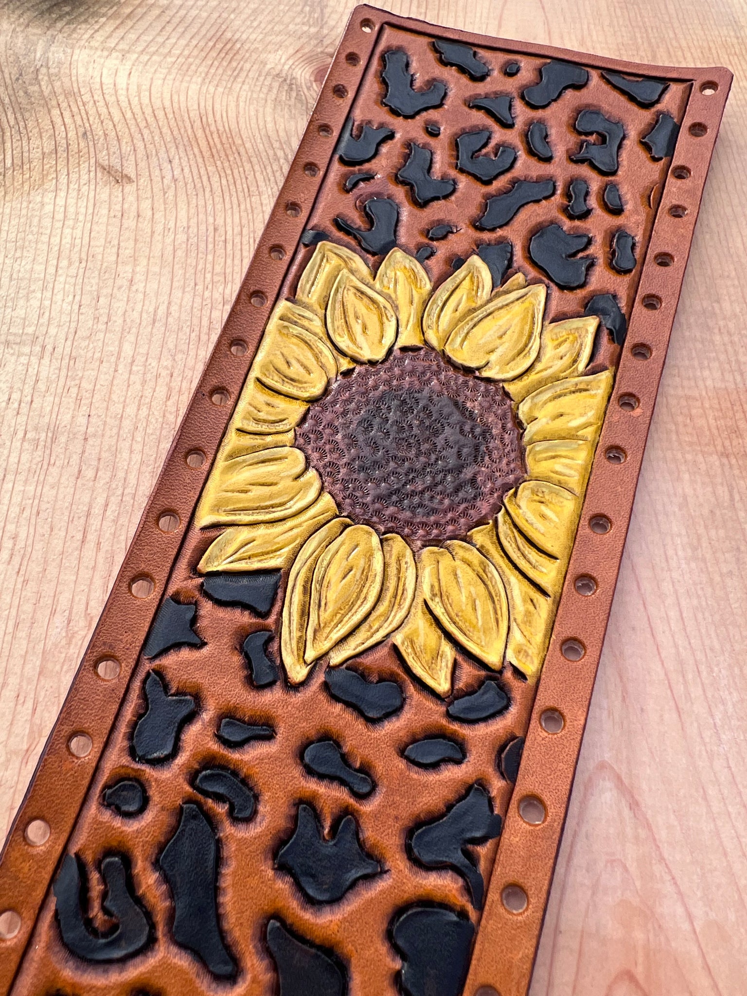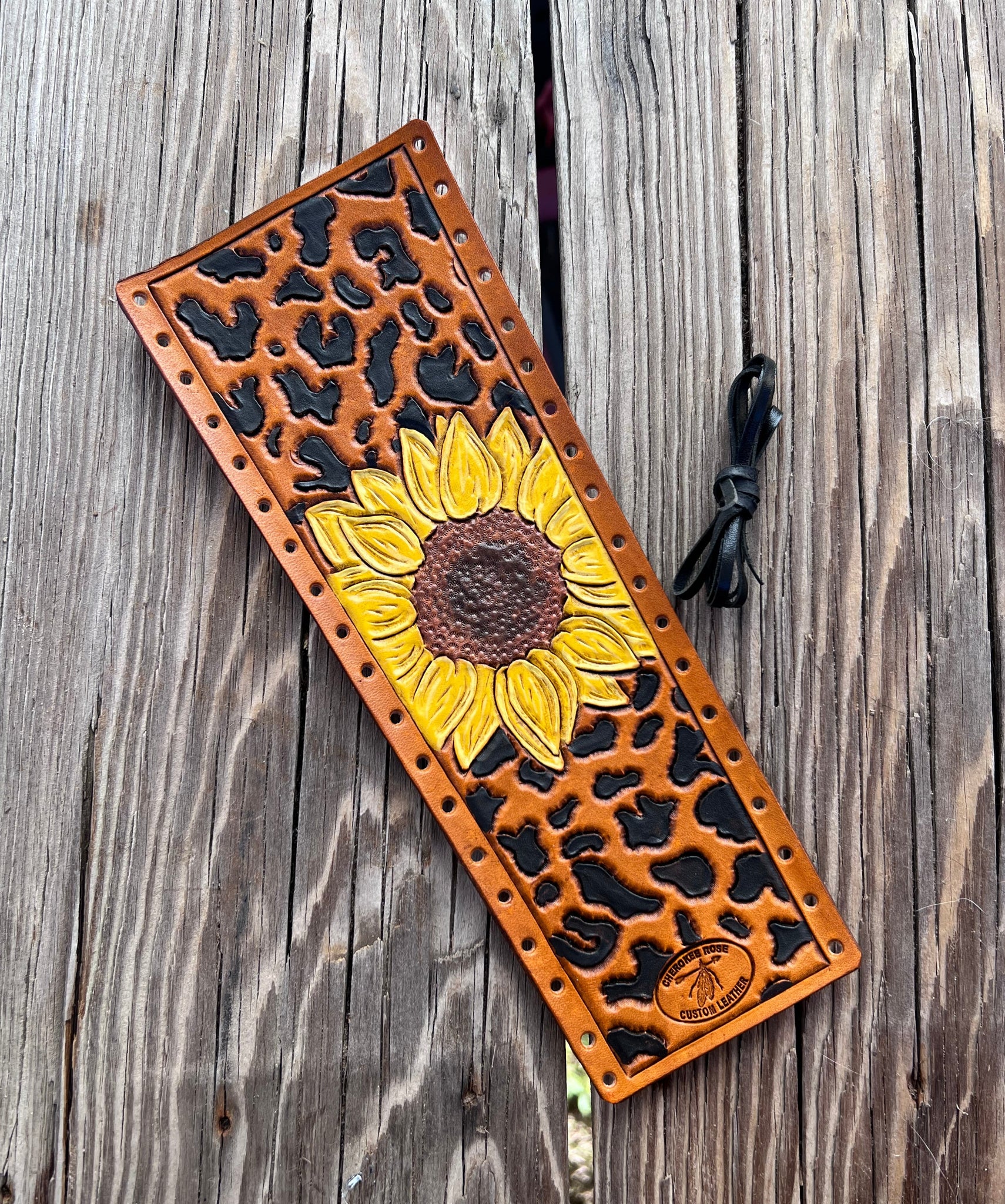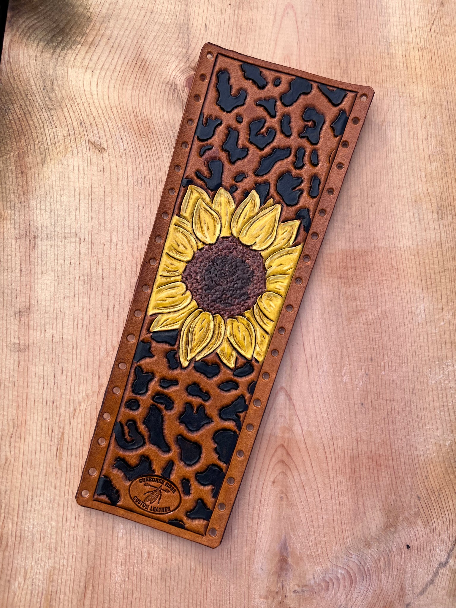Enjoy a unique and stylish look with this 100% real cowhide leather show stick wrap. It features a single sunflower and hand painted leopard spots - a combination sure to turn heads! The modern-inspired design is one of our most popular designs I've created to date!