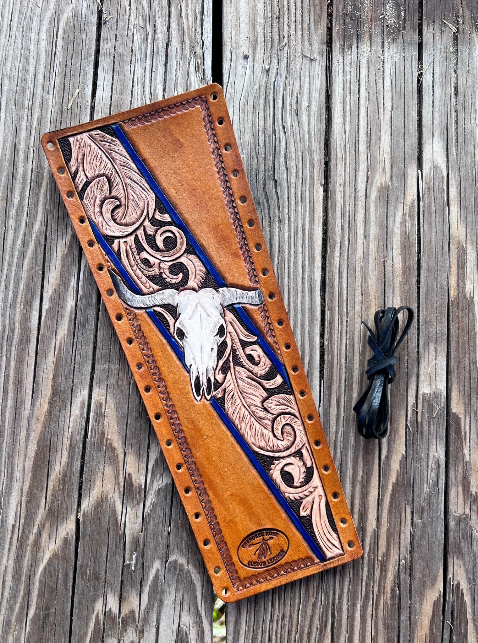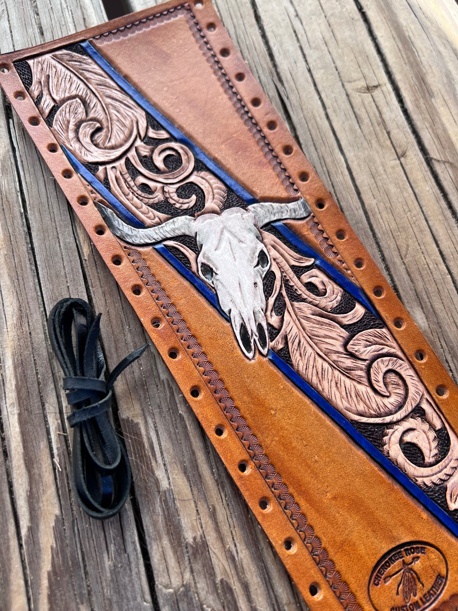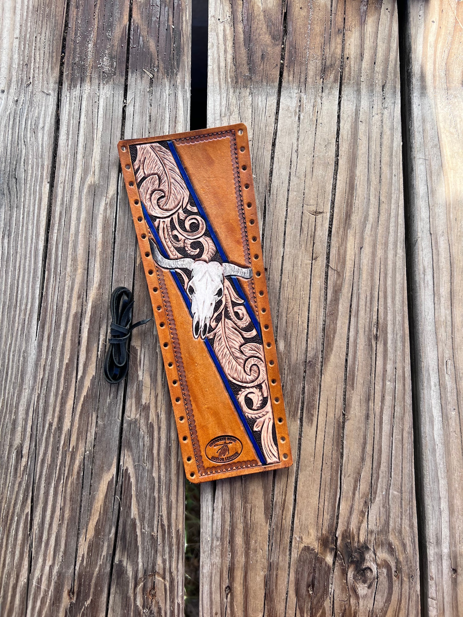 This Longhorn Skull and Feathers Leather Show Stick Wrap is perfect for the cowboy looking to strut their stuff! Hand carved designs including feathers, traditional western scrollwork, and a hand painted longhorn skull with a rich, blue border make this the ideal accessory for the best livestock shower!