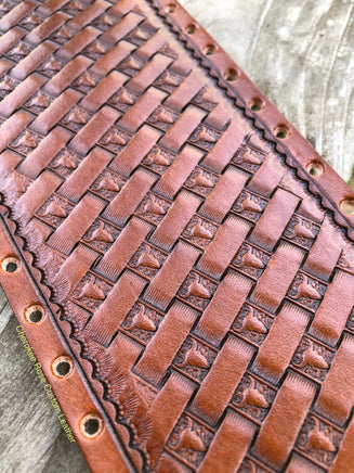 Unique Texas Longhorn basket weave stamp, hand stamped into the leather and then antiqued and sealed in a rich brown color.