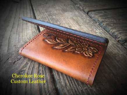 Our carved leather trifold wallets are all about you and your personality! I can create a unique design just for you. I can fully carve the exterior, or add just a little something-something on the interior fold.
