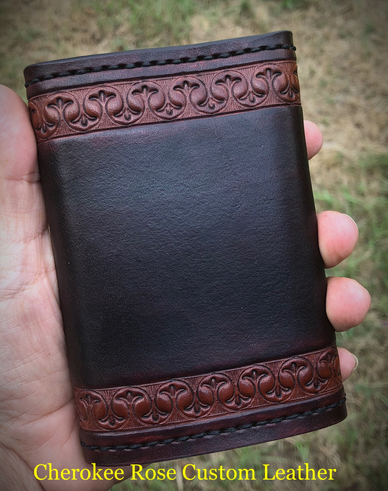 100% handmade from leather vegetable tanned leather, you can choose from a border stamped design, or pick a special single stamp or I can put initials on the front.