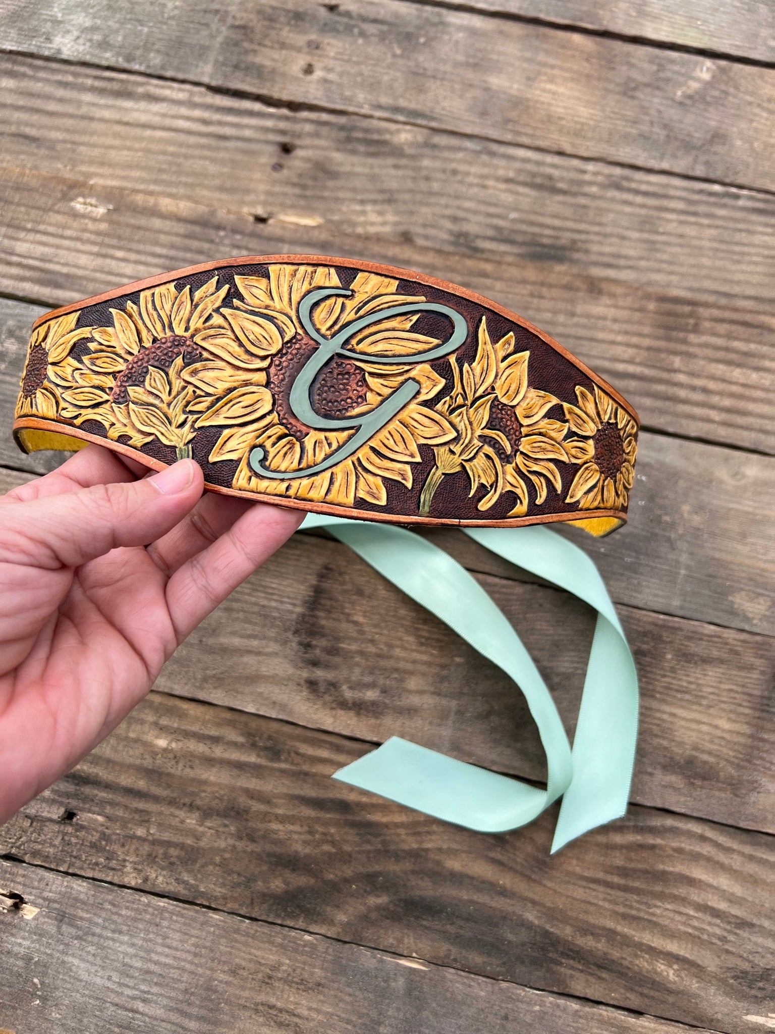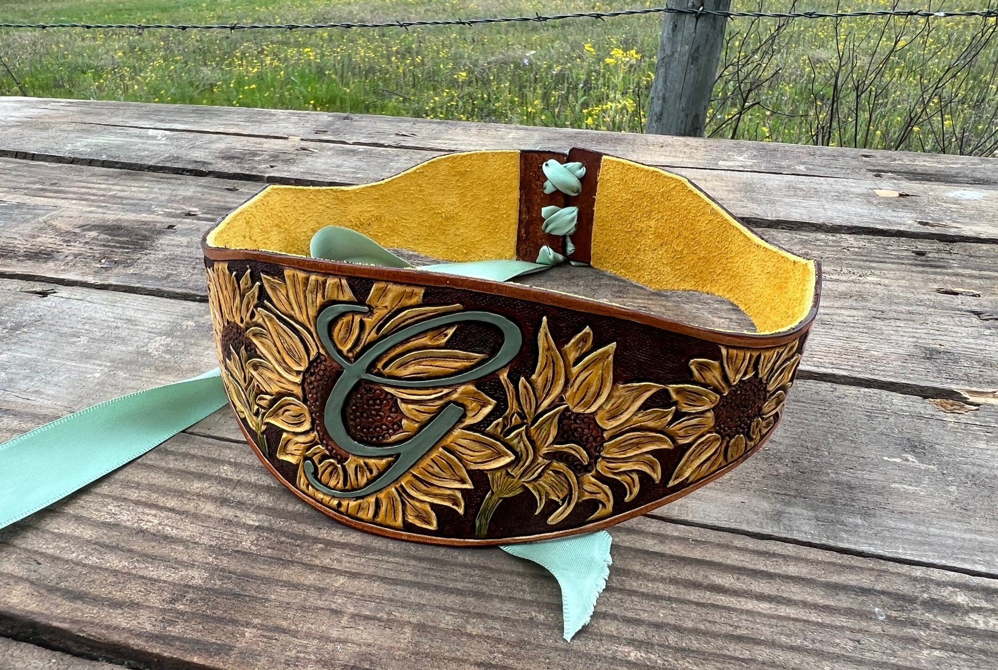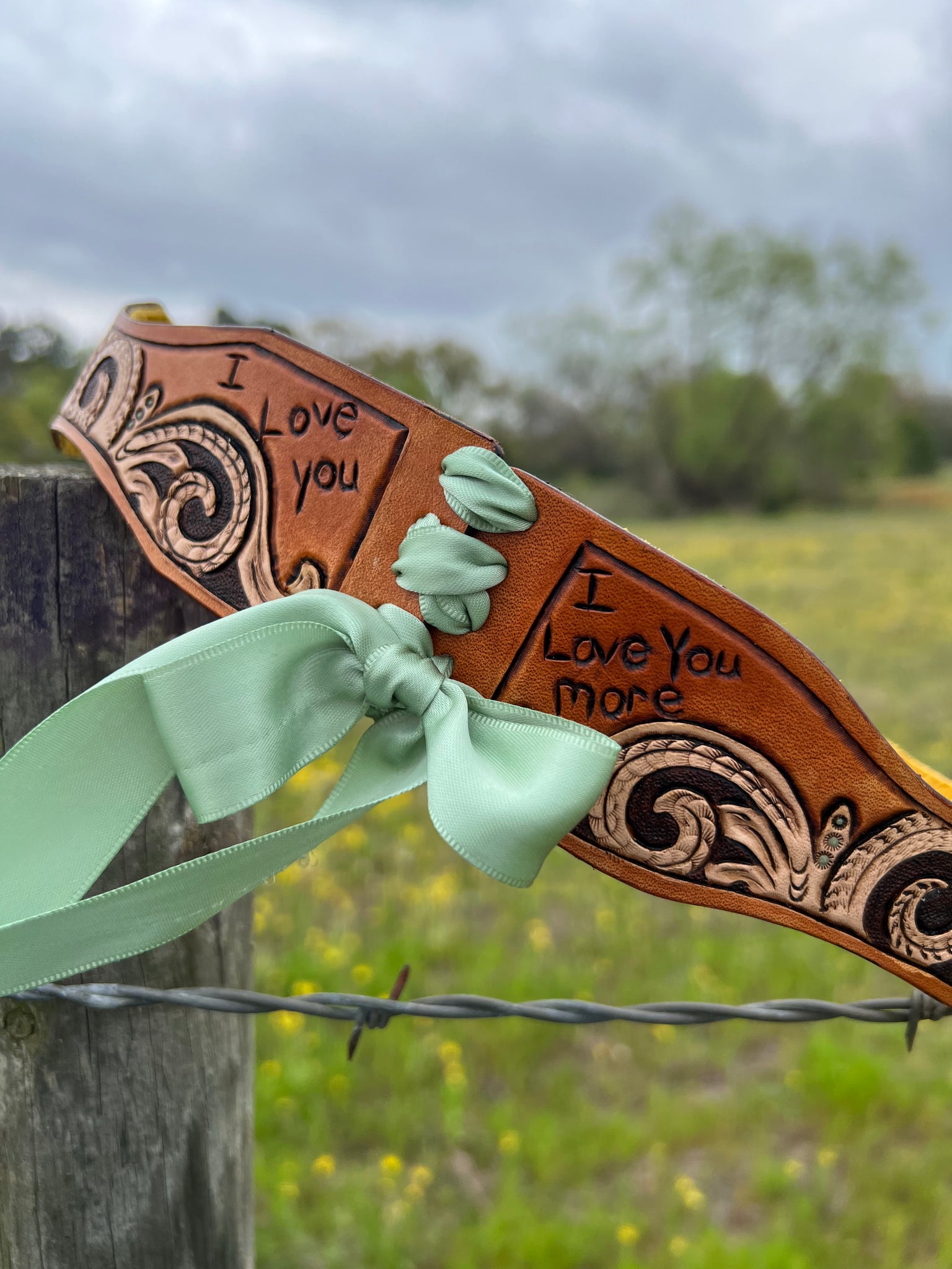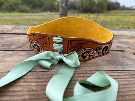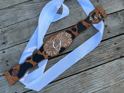 Tie the knot in style with our Custom Ordered Leather Wedding Garter! Hand carved and lined with a coordinating, soft cowhide chap leather, this unique bride's garter is custom designed for your special day. Say "I do" to a one-of-a-kind accessory that will make your wedding day even more memorable.