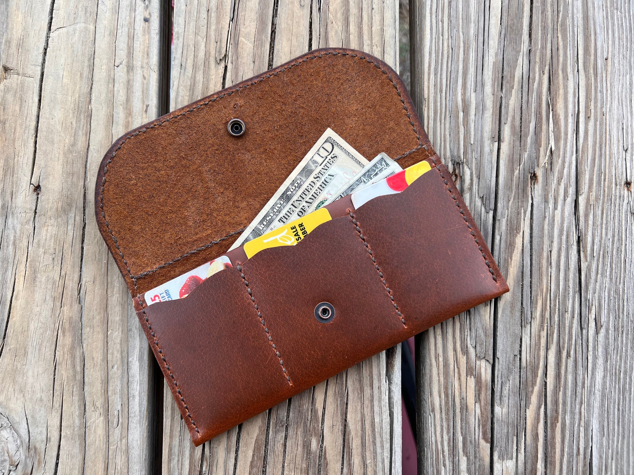 Holds 3 cards and has a roomy cash pocket for all your adventures. 100% hand stitched