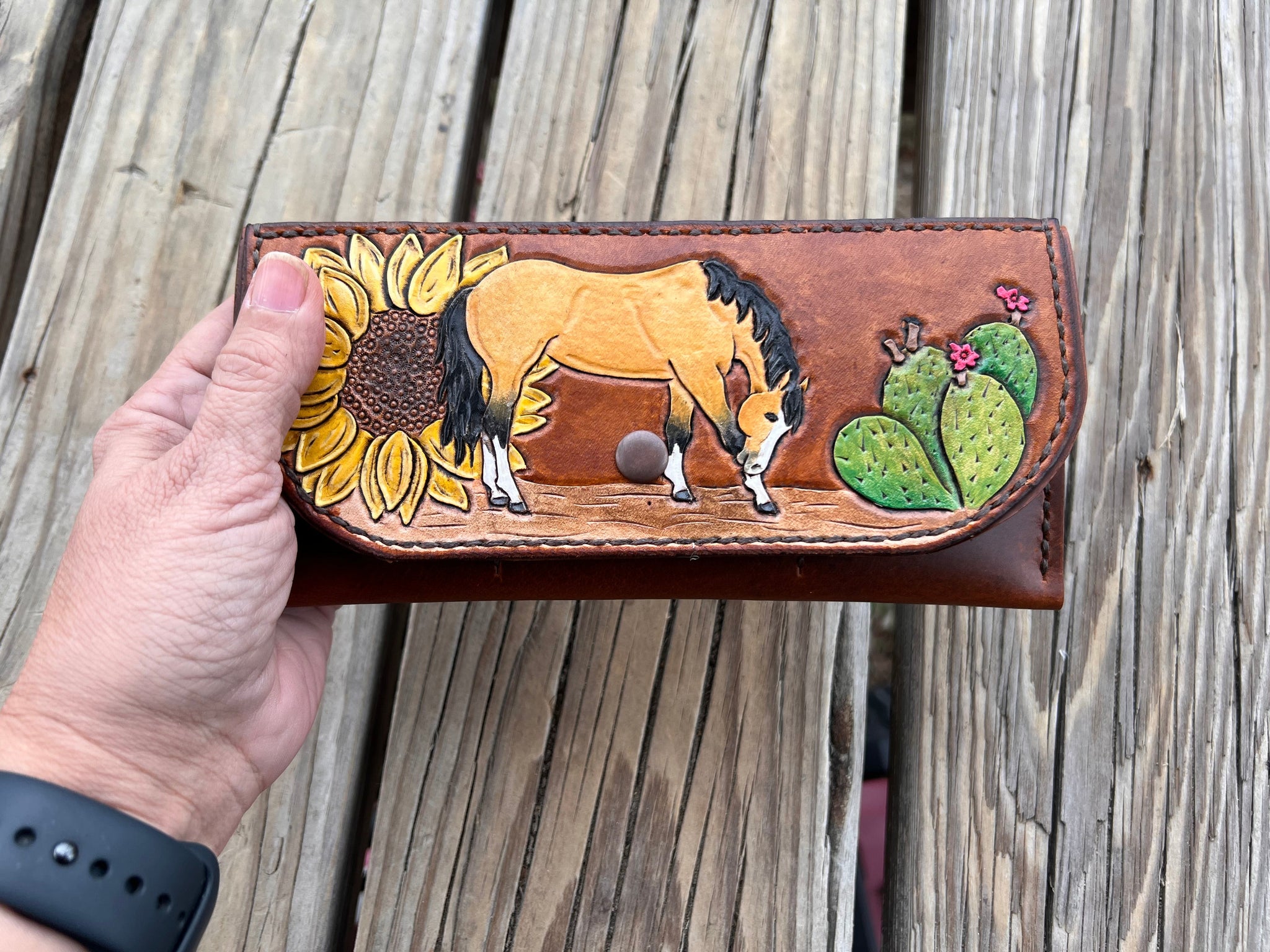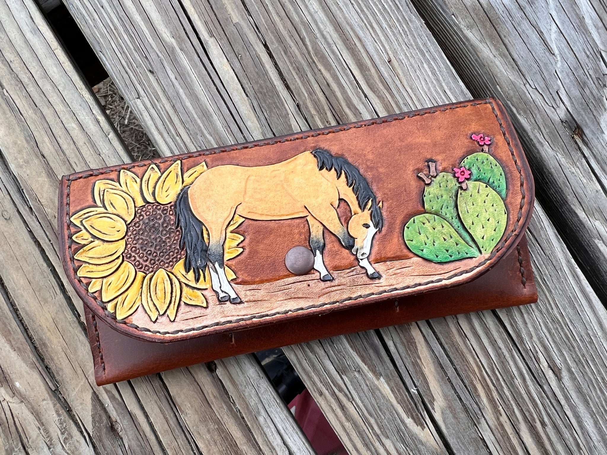 Unleash your inner cowgirl with this Buckskin Horse Clutch Wallet. Handcrafted in Texas with oil tanned leather for the body and vegetable tanned leather for the tooled design, it features a playful hand-painted buckskin horse, sunflower, and cactus design.