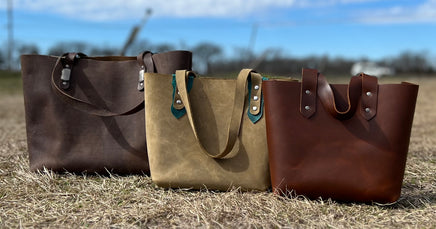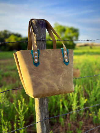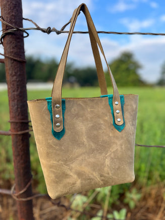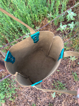 This elegant light brown leather tote is hand crafted from oil-tanned leather and features beautiful hand stitched seams and rustic turquoise accents with nickel spots. Its convenient size means you can take it wherever you go in style and comfort. Are you ready to experience the luxury of a handmade leather tote?
