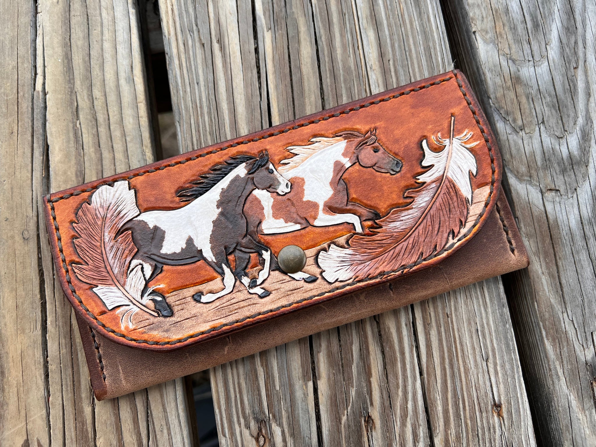 Add some whimsy to your wallet with our Running Paint Horses 3 Card Ladies Clutch Wallet! Featuring hand painted galloping tobiano paint horses and rustic brown oil tanned leather, this wallet is both playful and practical with 3 card slots and a large cash pocket. Hand stitched and carved on vegetable tanned leather, it's a truly unique accessory. (And did we mention the antique brass snap closure? It's the cherry on top!)