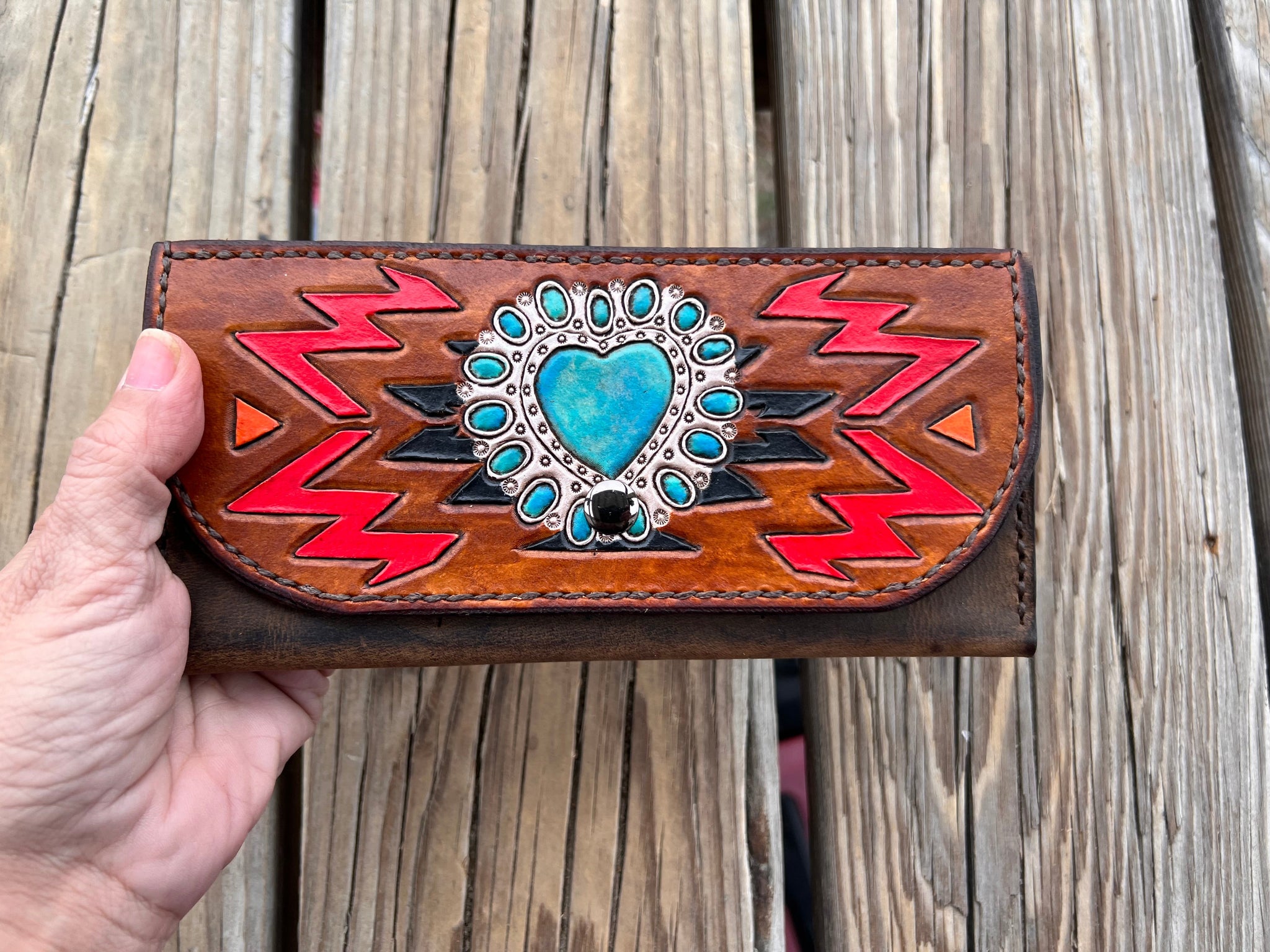 The heart is creatively hand carved, tooled and painted to resemble the Old Pawn jewelry of days gone by. The body of this wallet is created from a darker oil tanned leather and the tooled piece on the front is made from vegetable tanned leather.