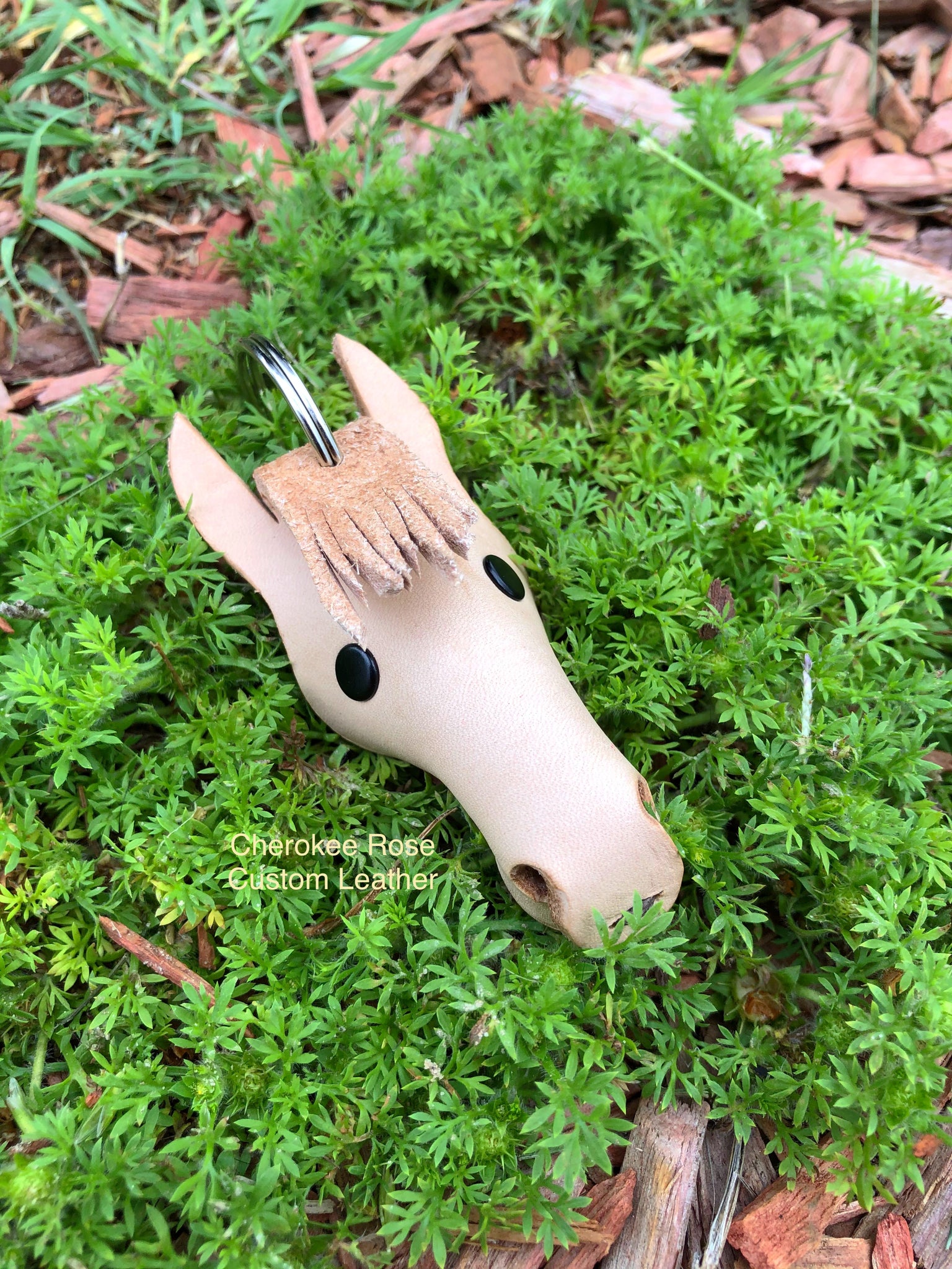 Our horse head leather key chain measures approx 1 1/2 inches across and is about 3 inches tall with out the key ring.