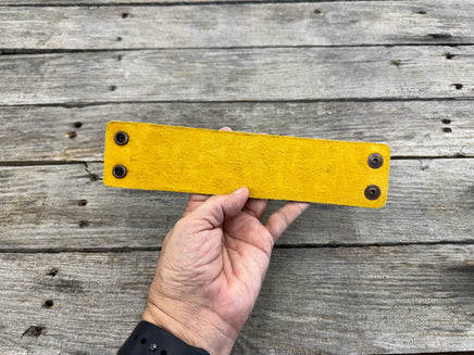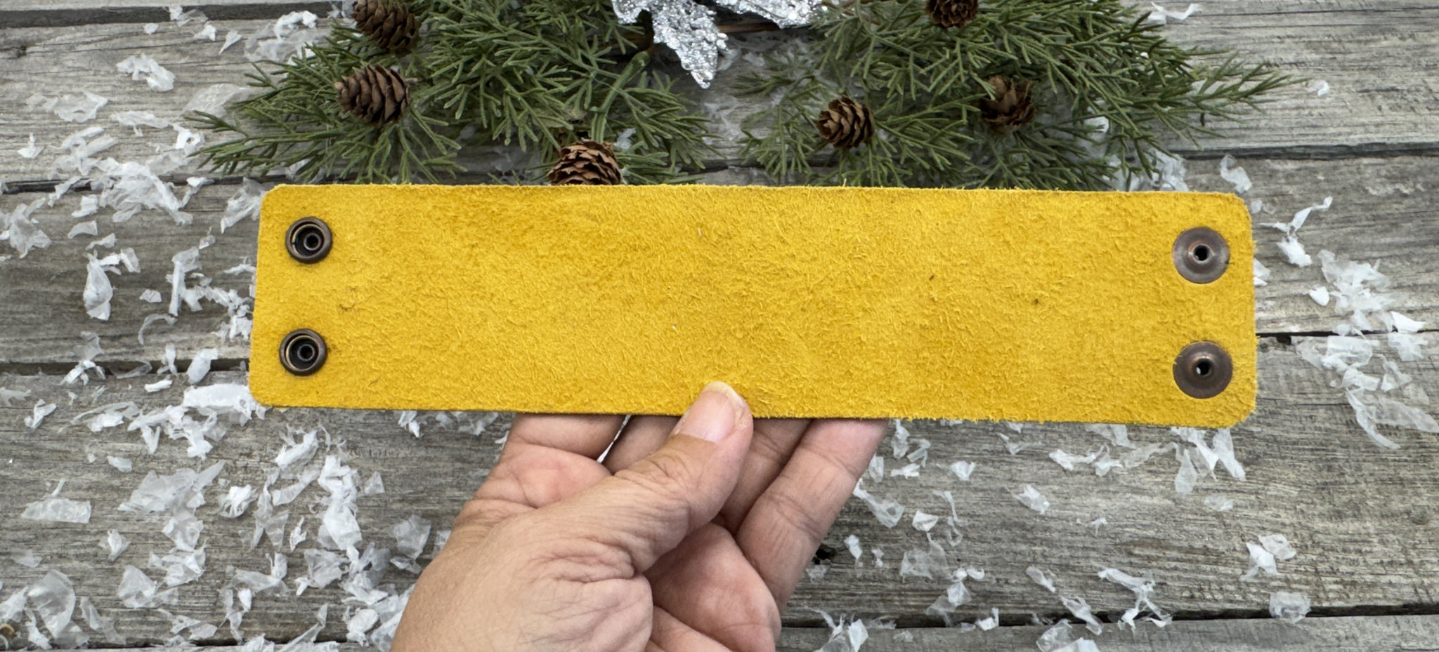 Crafted from 4/5 oz full-grain leather, this cuff is 8 ¾” long with antique copper snaps set at 8” for a secure and comfortable fit. Measuring 2” wide, it’s lined with soft yellow pigskin suede leather, adding a bright contrast to the warm saddle-brown tones of the outer leather.