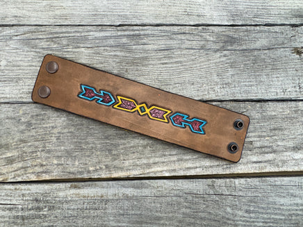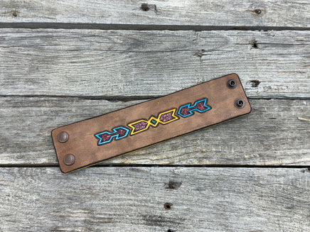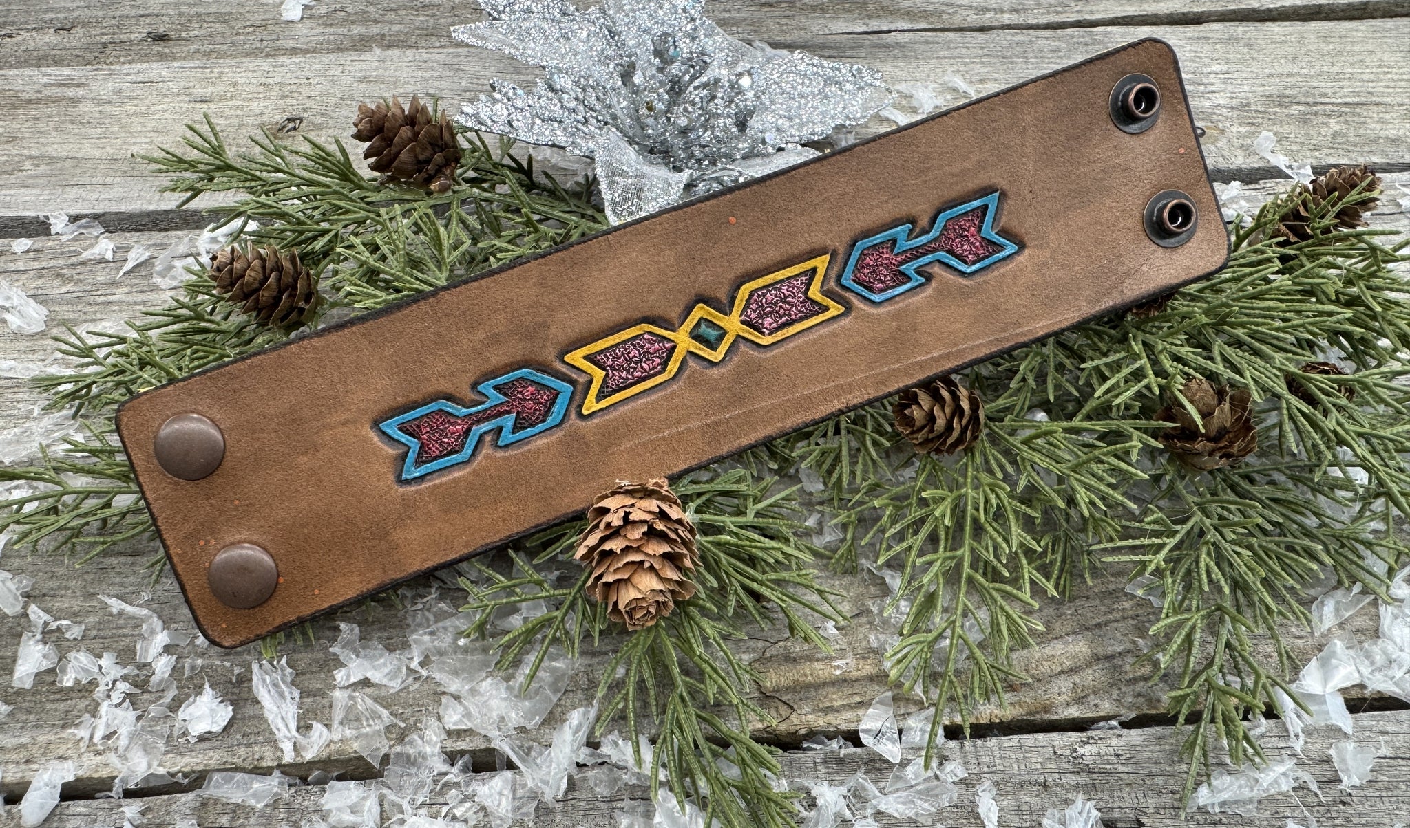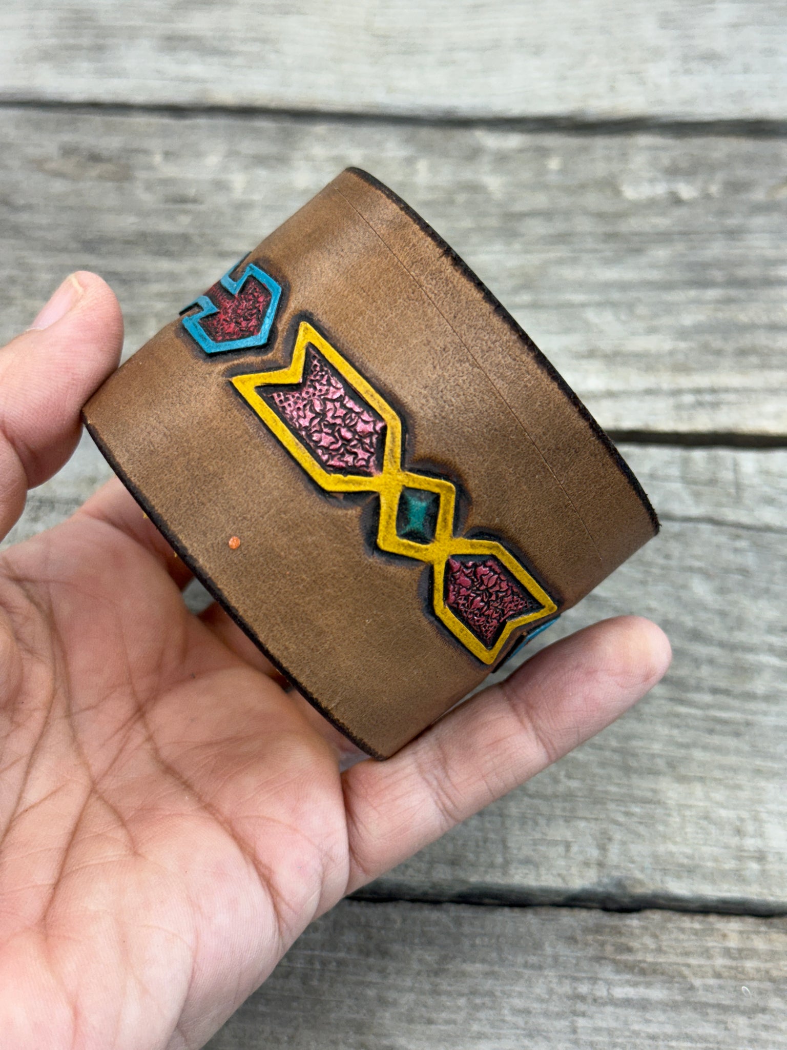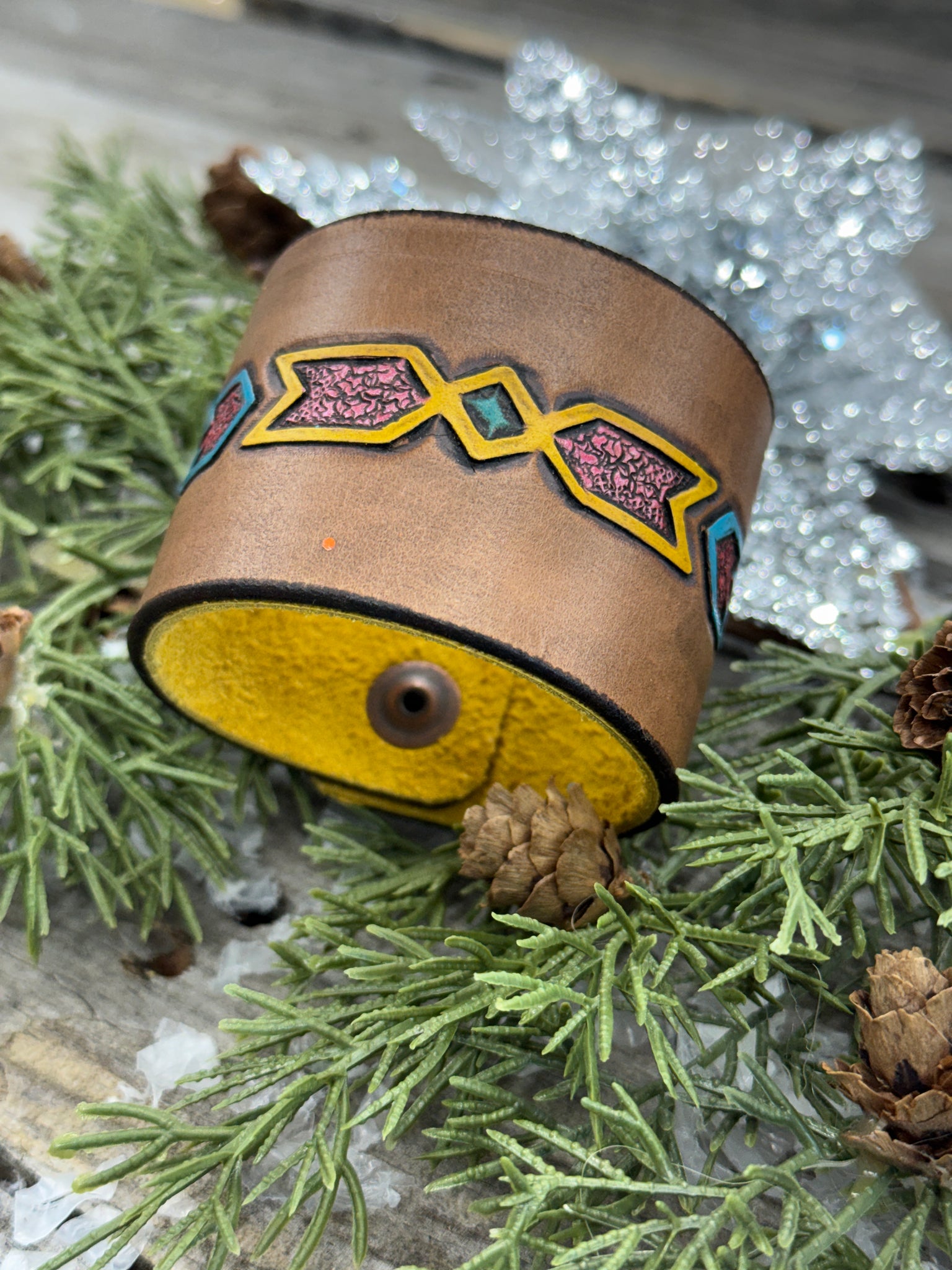 This wide hand-carved leather cuff bracelet blends bold color with classic Western style. The tribal-inspired pattern features turquoise arrows and a yellow centerpiece, each outlined and painted by hand for a clean, vibrant finish.