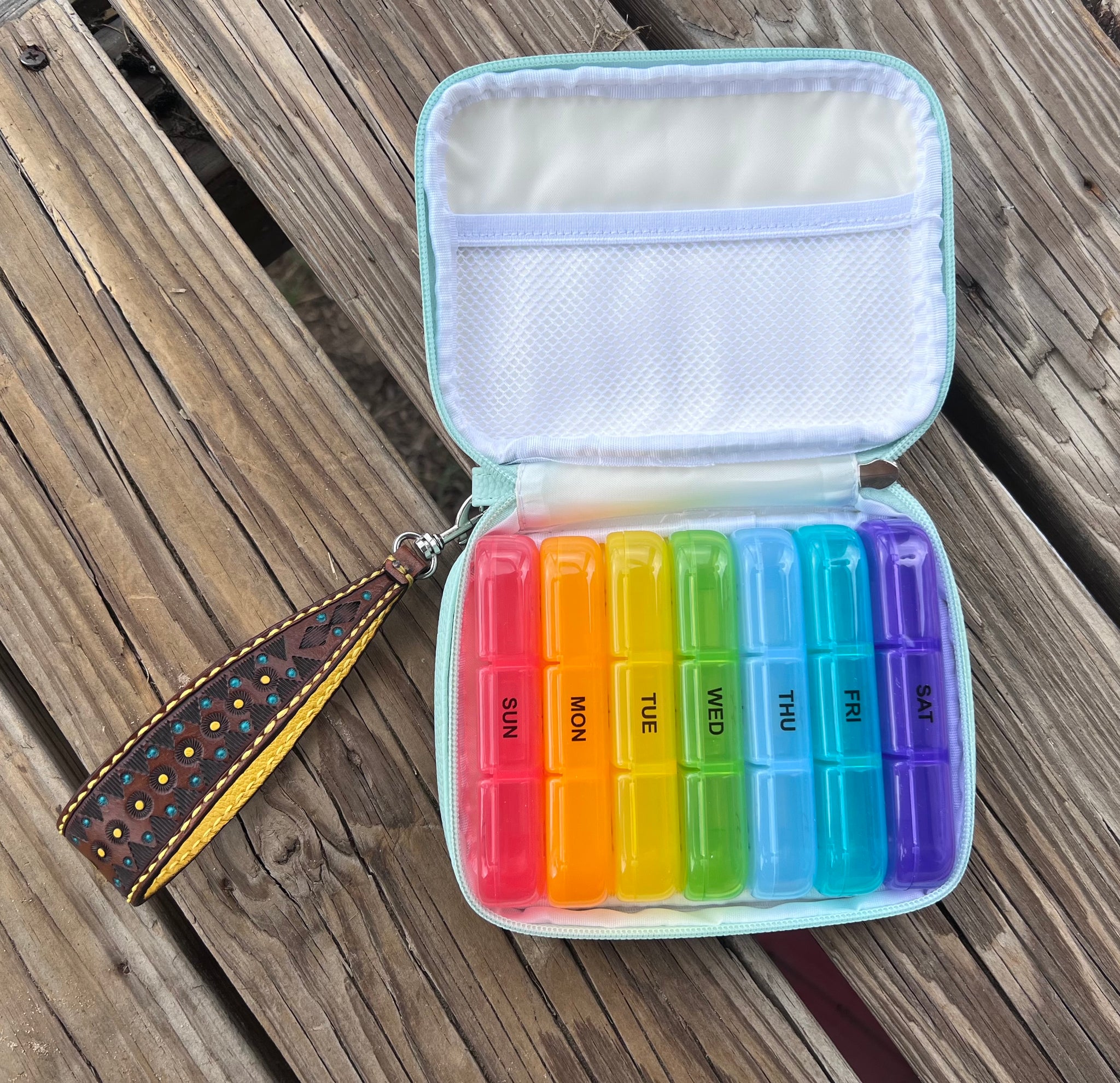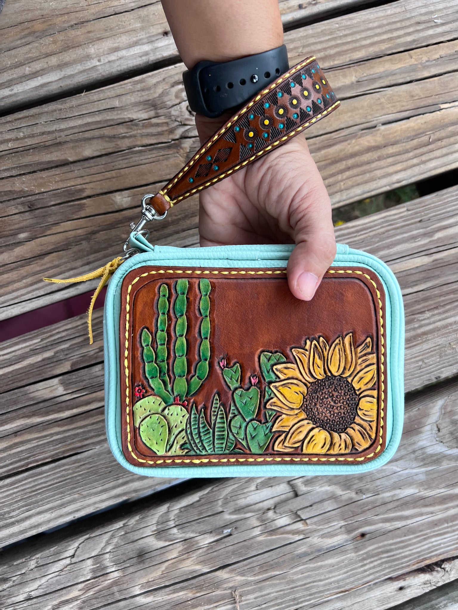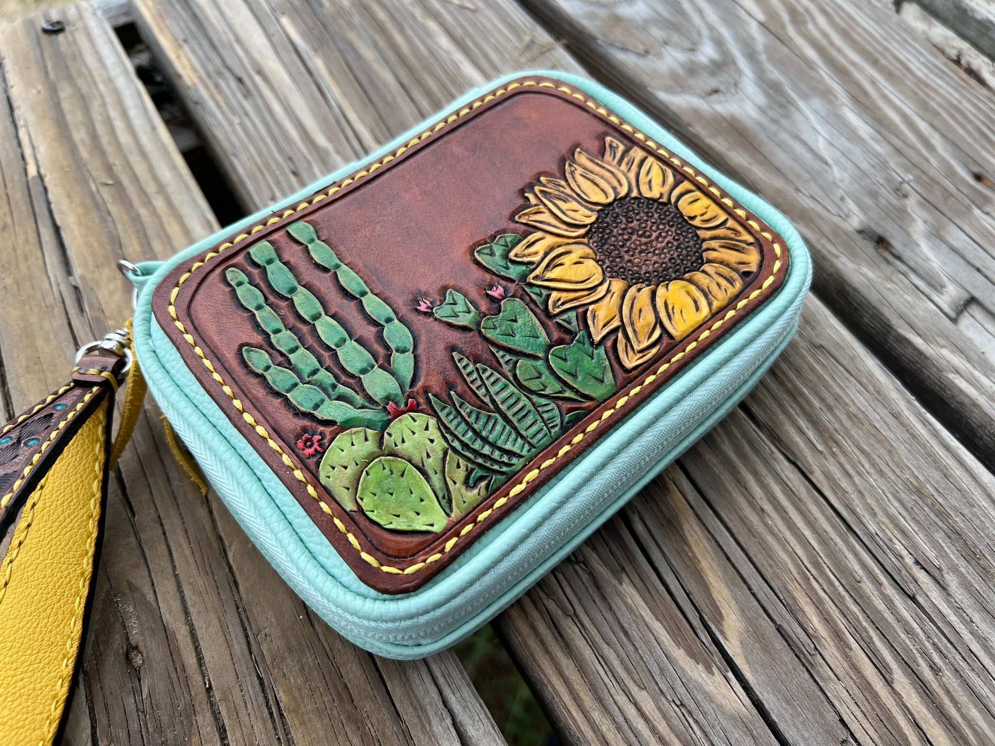 This one-of-a-kind Custom Leather Covered Pill Organizer is artfully hand painted with beautiful sunflowers and cactus. Created with hand-carved leather and a hand-tooled design, it adds a little fun to your daily pill regiment.