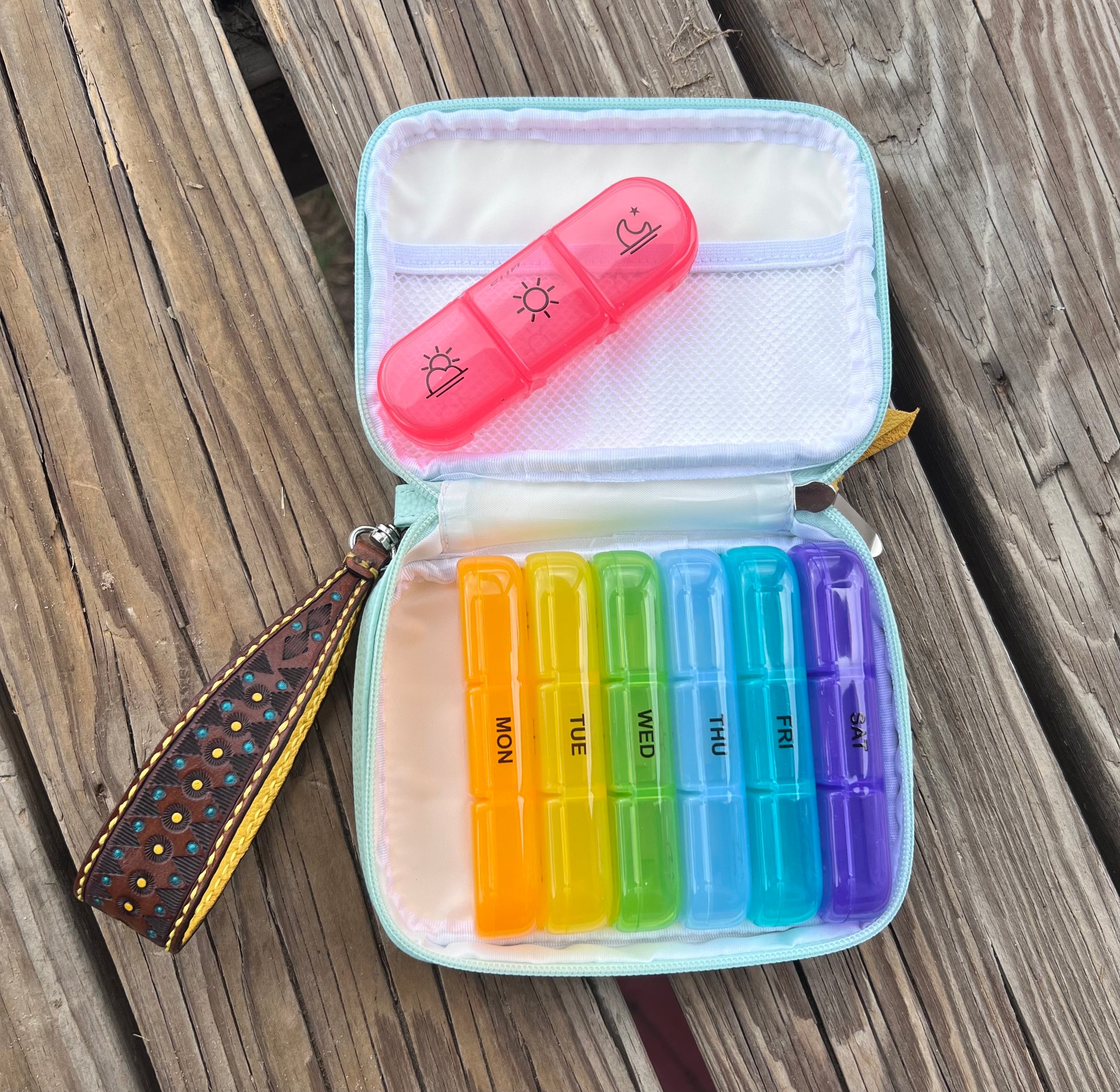 Case measures approx. 6.5 inches long by 5 inches wide and is about 2 inches deep. It includes a pill case for each day of the week, with a morning, afternoon and evening compartment.