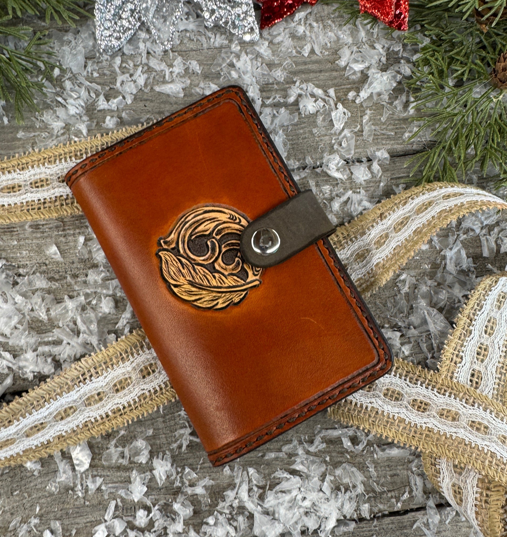 Refined craftsmanship meets timeless Western artistry in this hand-carved leather memo pad holder from Cherokee Rose Custom Leather.