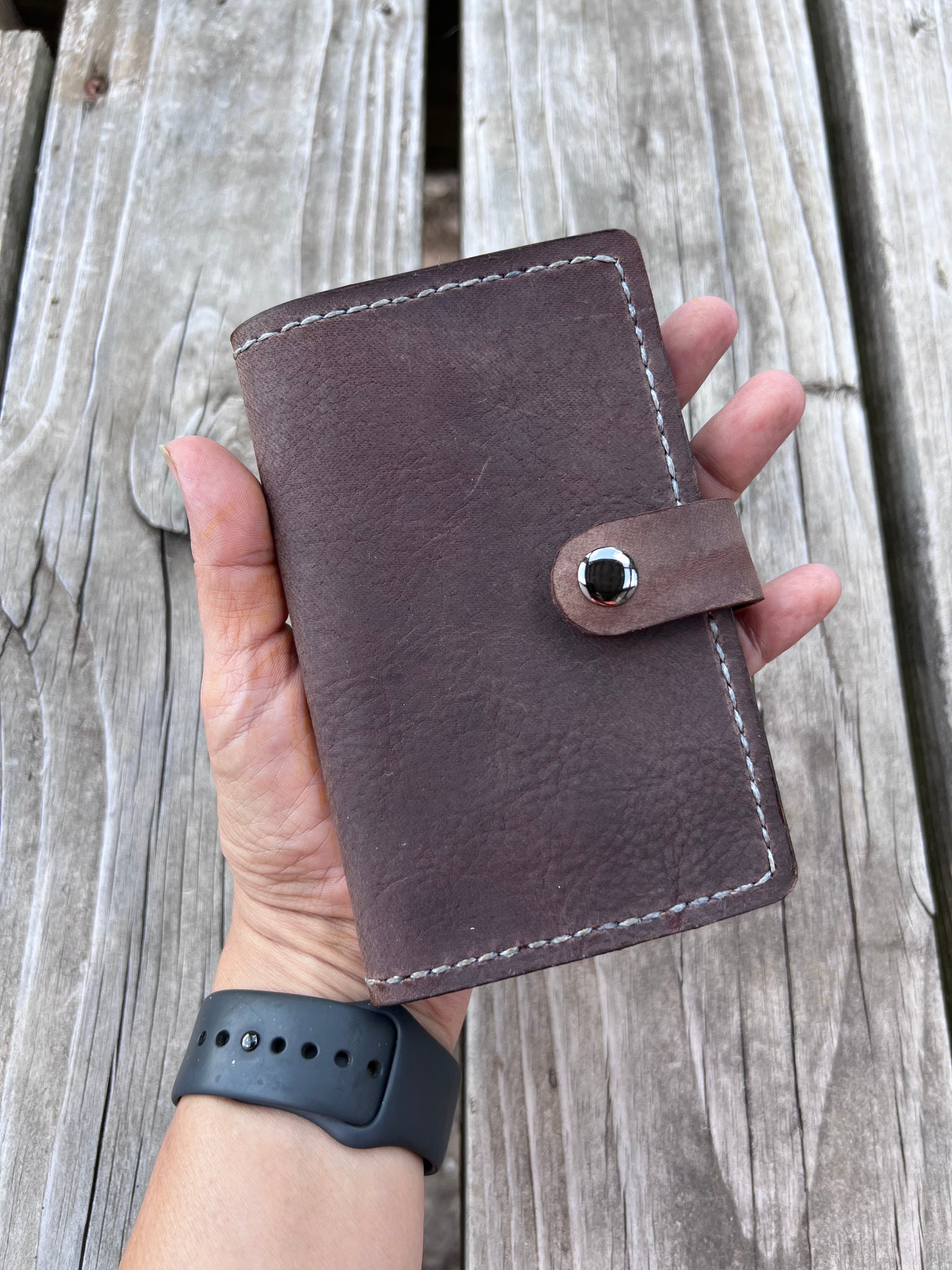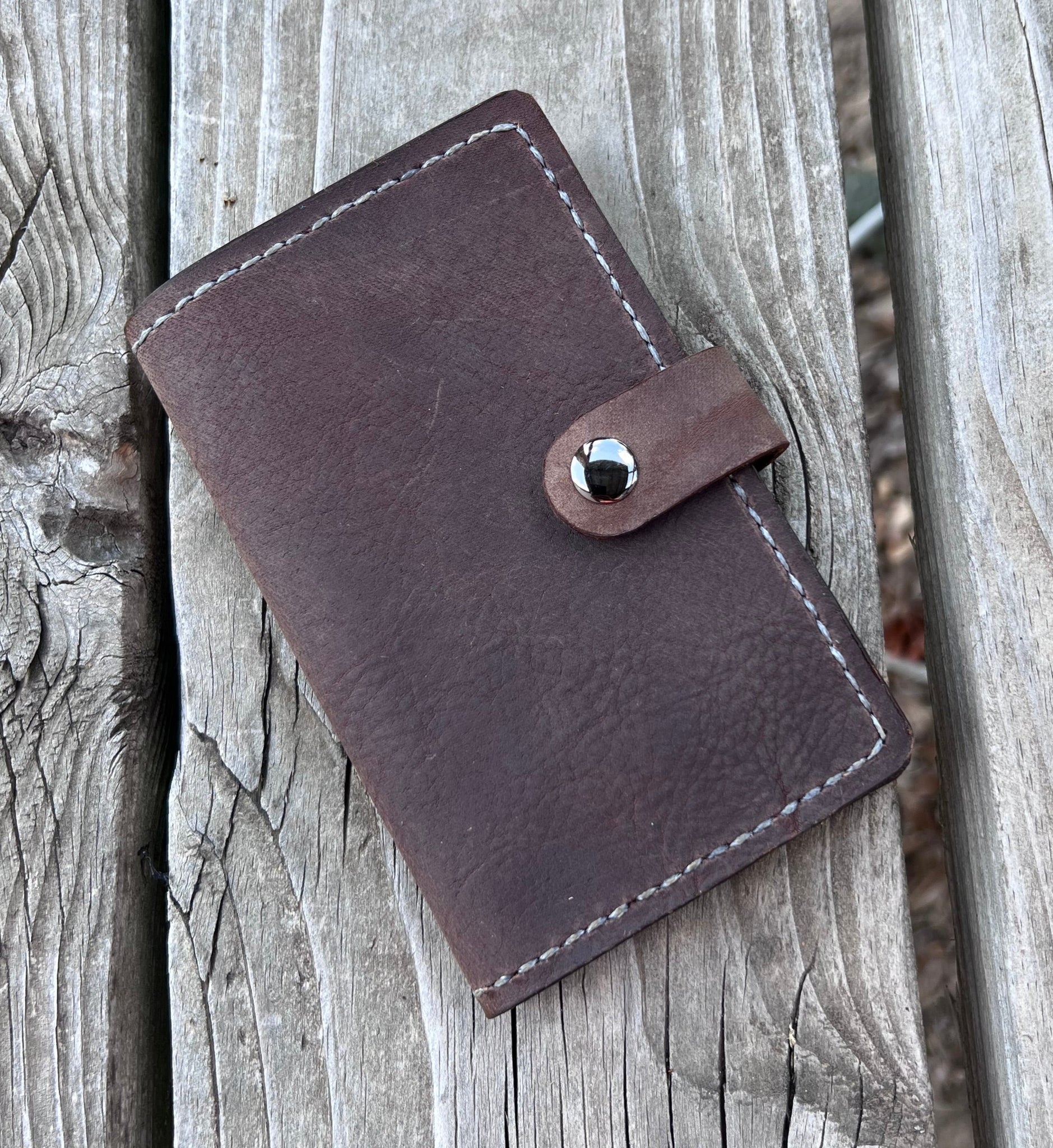 Crafted from oil tanned real cowhide leather and hand stitched with waxed grey thread for durability, it features two pockets, a card holder, and a snap closure for added security.