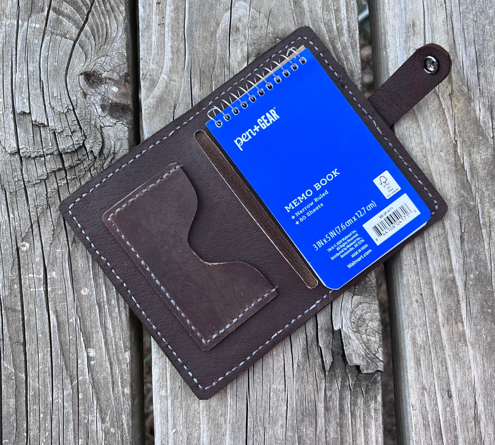 Oil tanned leather memo pad holder measures approx 3.75 inches wide and 5.75 inches tall when closed.