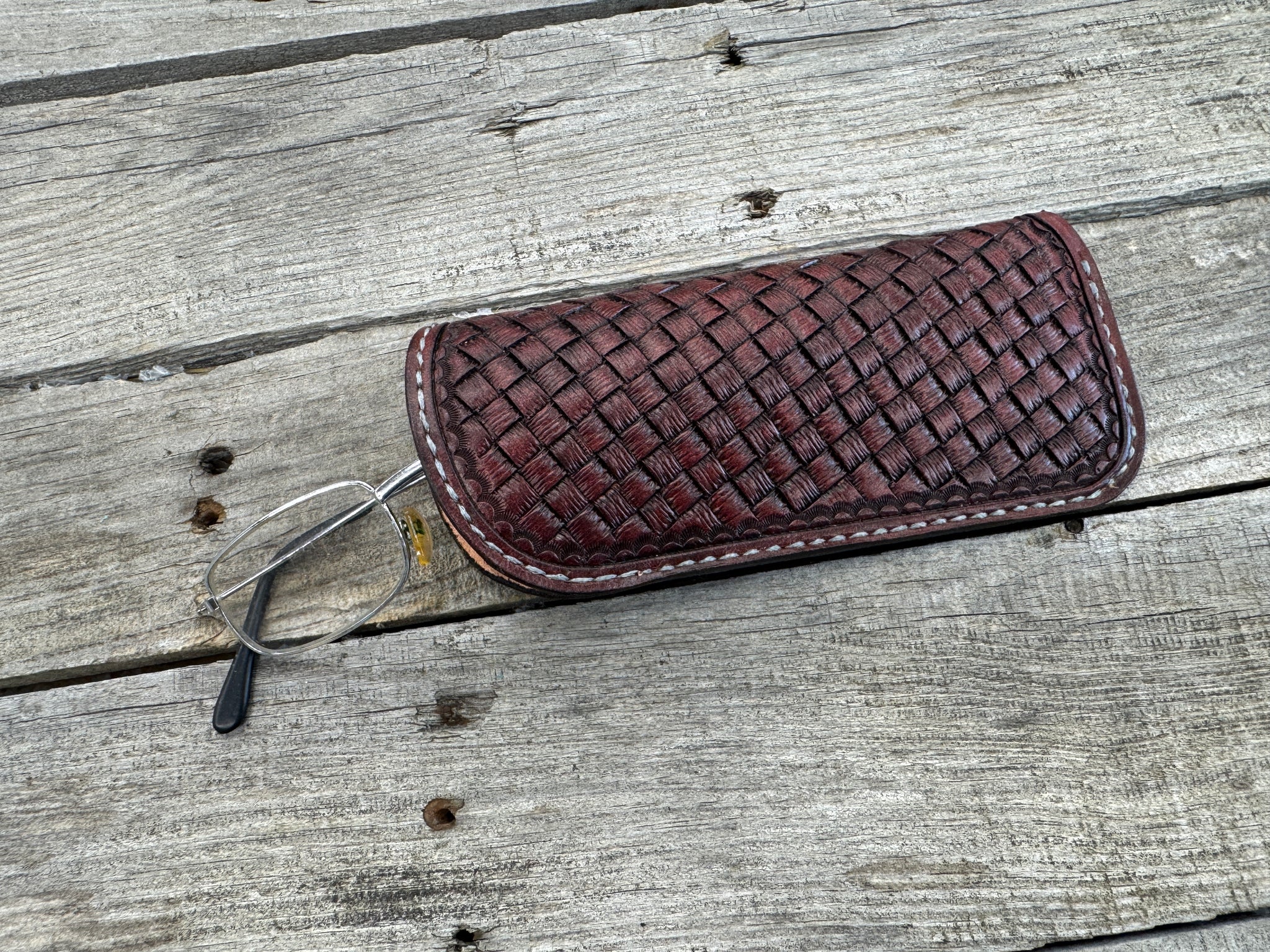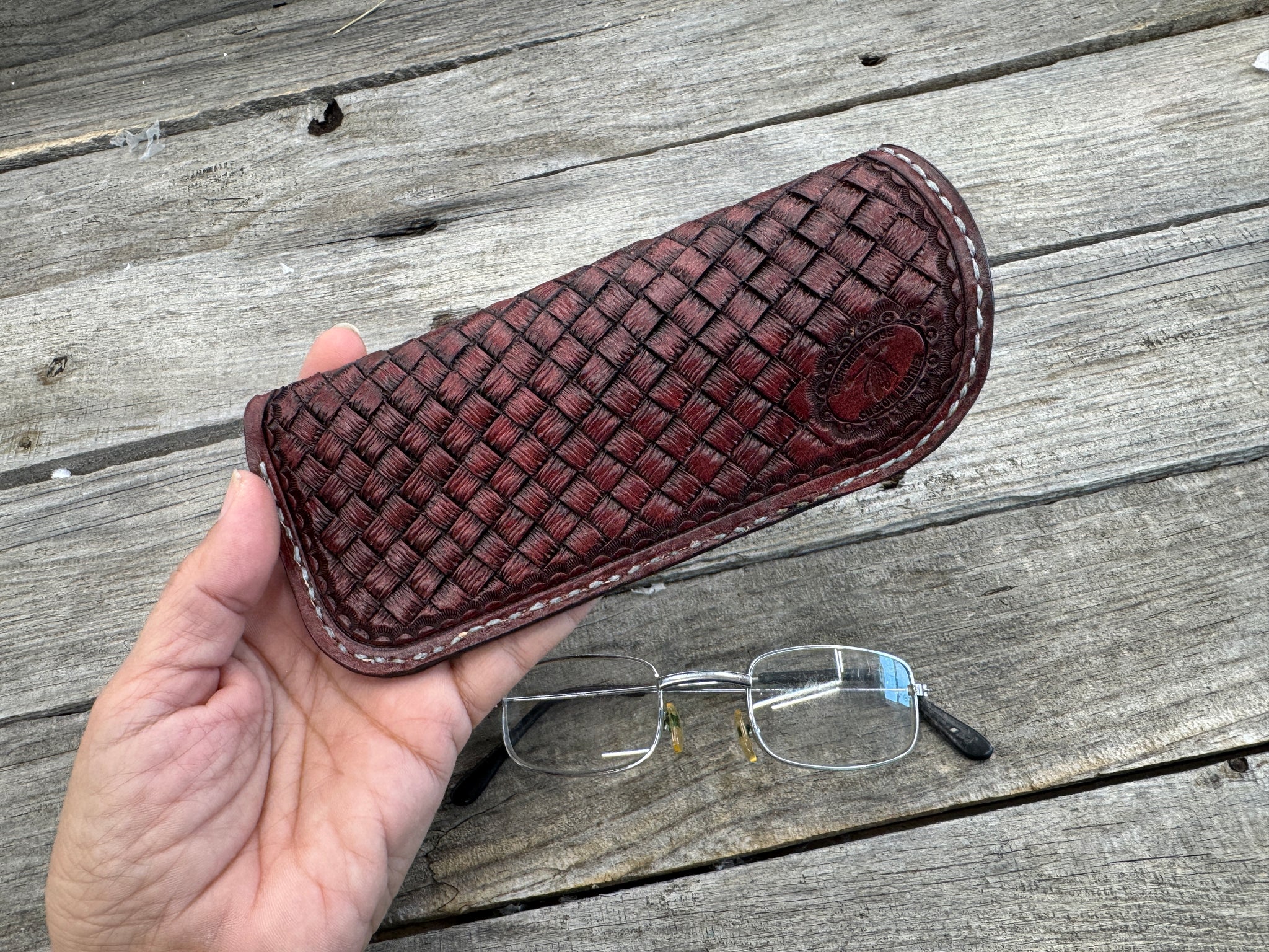 Elevate your everyday essentials with this hand-stamped leather eyeglasses case, showcasing a woven basketweave pattern in a striking Bordeaux finish. Each piece is crafted from premium Live Oak leather, hand-dyed, stitched with gray thread, and burnished by Cherokee Rose Custom Leather in East Texas.