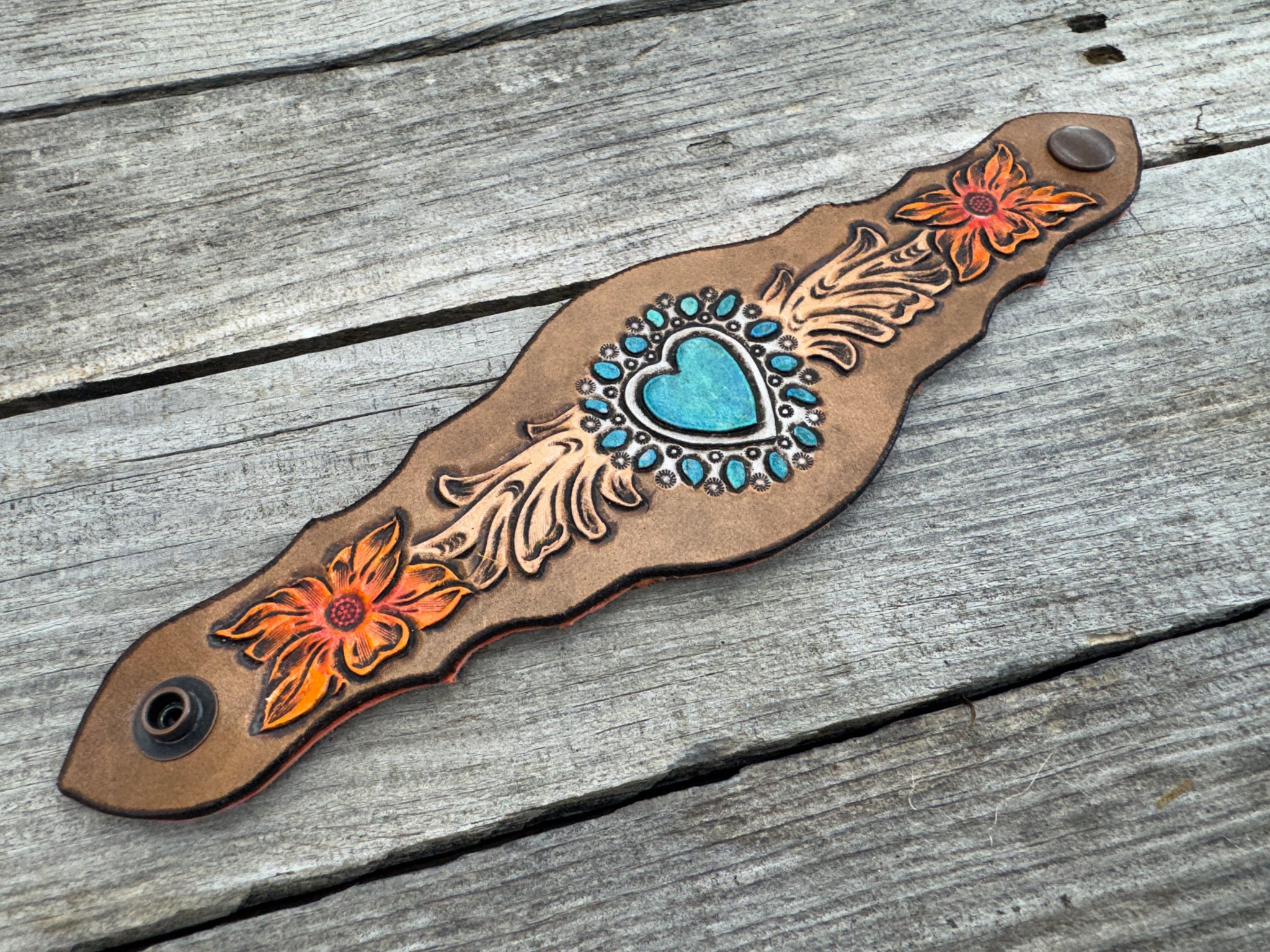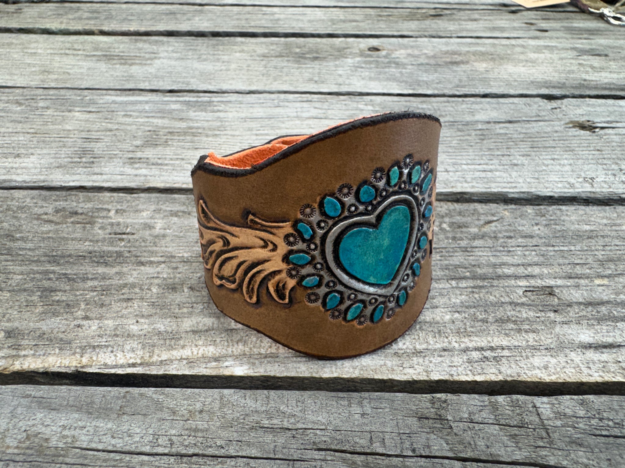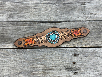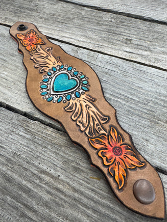 This striking hand-carved leather cuff bracelet features a turquoise heart centerpiece inspired by Old Pawn Navajo jewelry, surrounded by flowing Western scrollwork and hand-painted orange flowers on each end. The scalloped shape adds elegance and comfort, while the vibrant colors make this cuff a true Western statement piece.