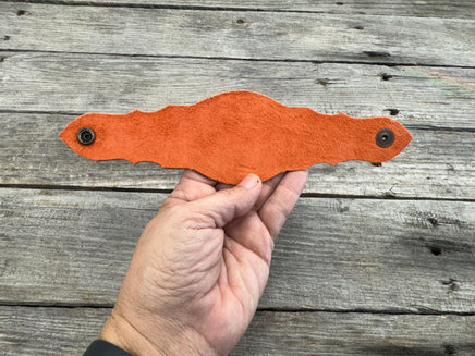 Crafted from 4/5 oz full-grain leather, this cuff is 8 ½” long with antique copper snaps set at 7 ½” for a comfortable fit. It measures 2 ¼” at its widest point and is lined with rustic orange pigskin suede, creating a warm contrast to the saddle-brown exterior.
