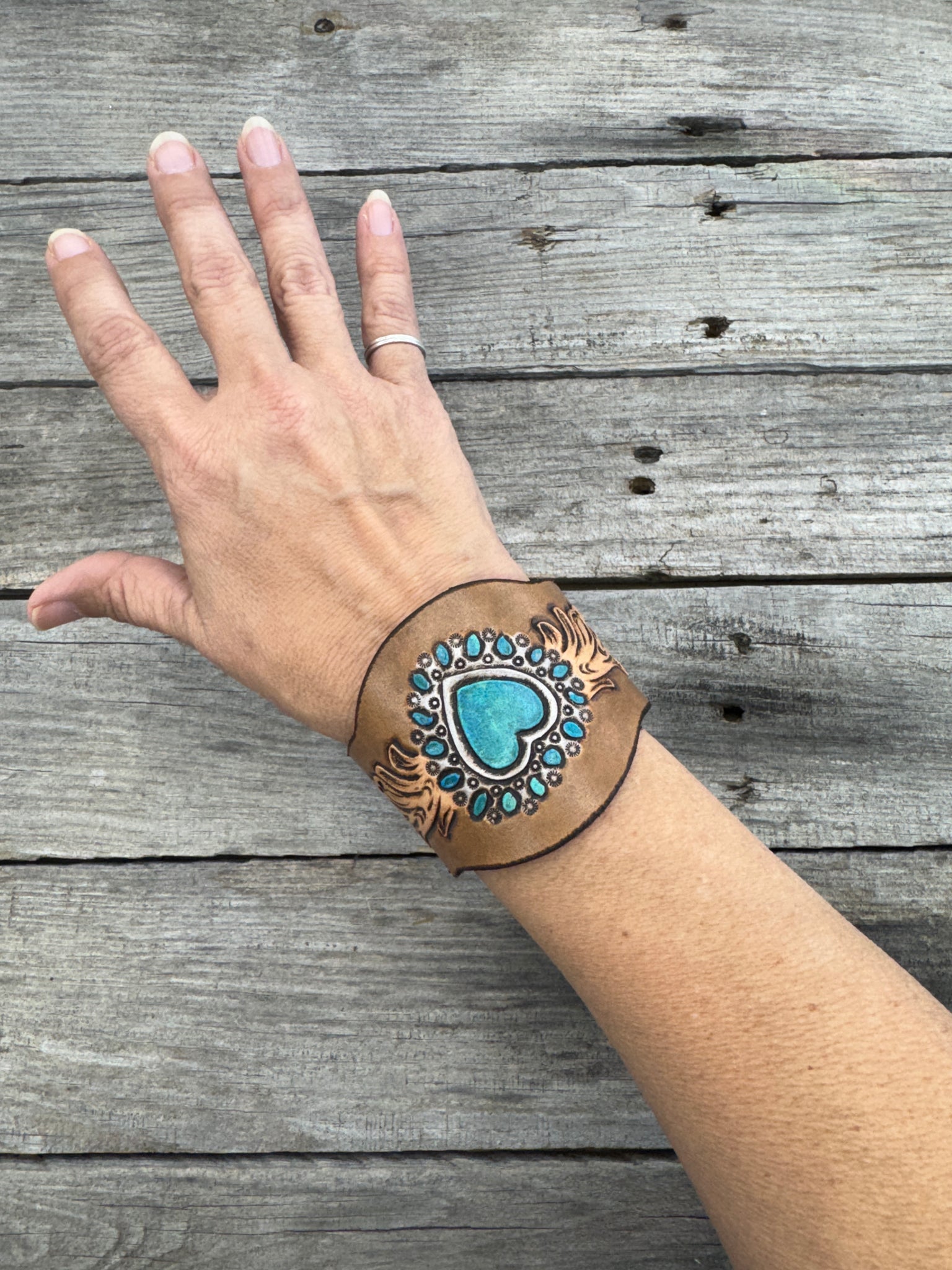 Each detail — from the tooled scrolls to the hand-painted turquoise heart — reflects hours of careful craftsmanship and artistry. Whether worn alone or paired with your favorite turquoise jewelry, this cuff adds bold Western charm to any outfit.