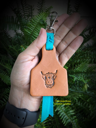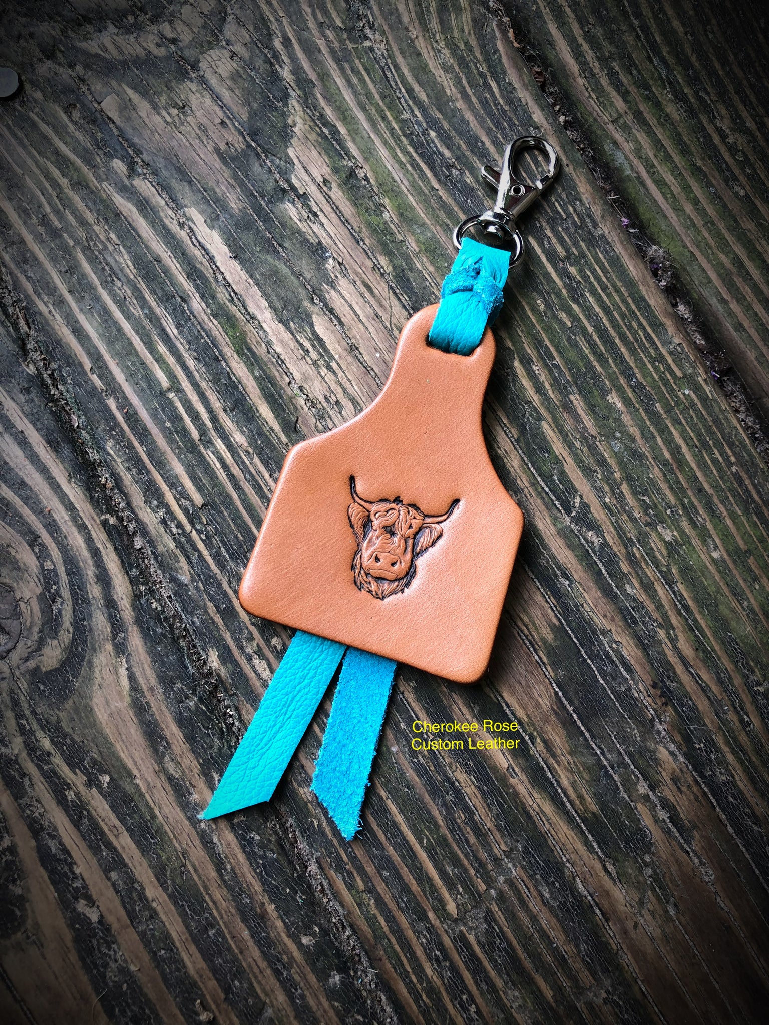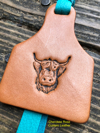 Super cute hand stamped leather key chain in an ear tag shape with a hairy, Highland cow design.