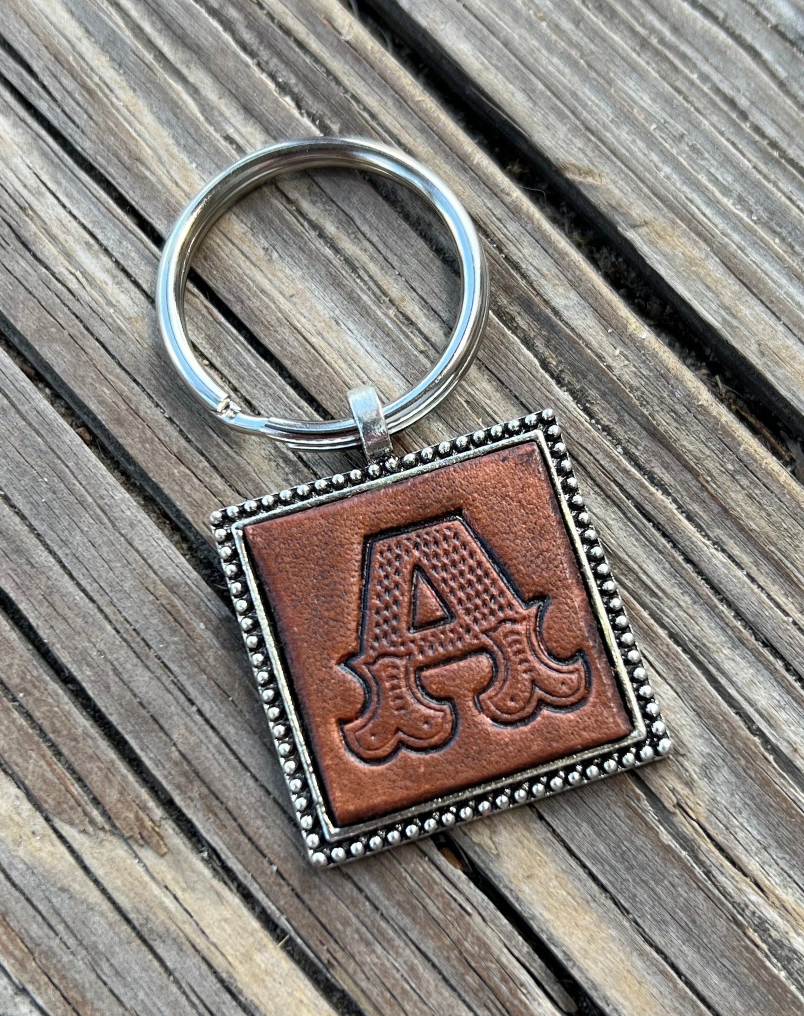 Show off your western style with a personalized, hand stamped initial key chain in real cowhide leather.