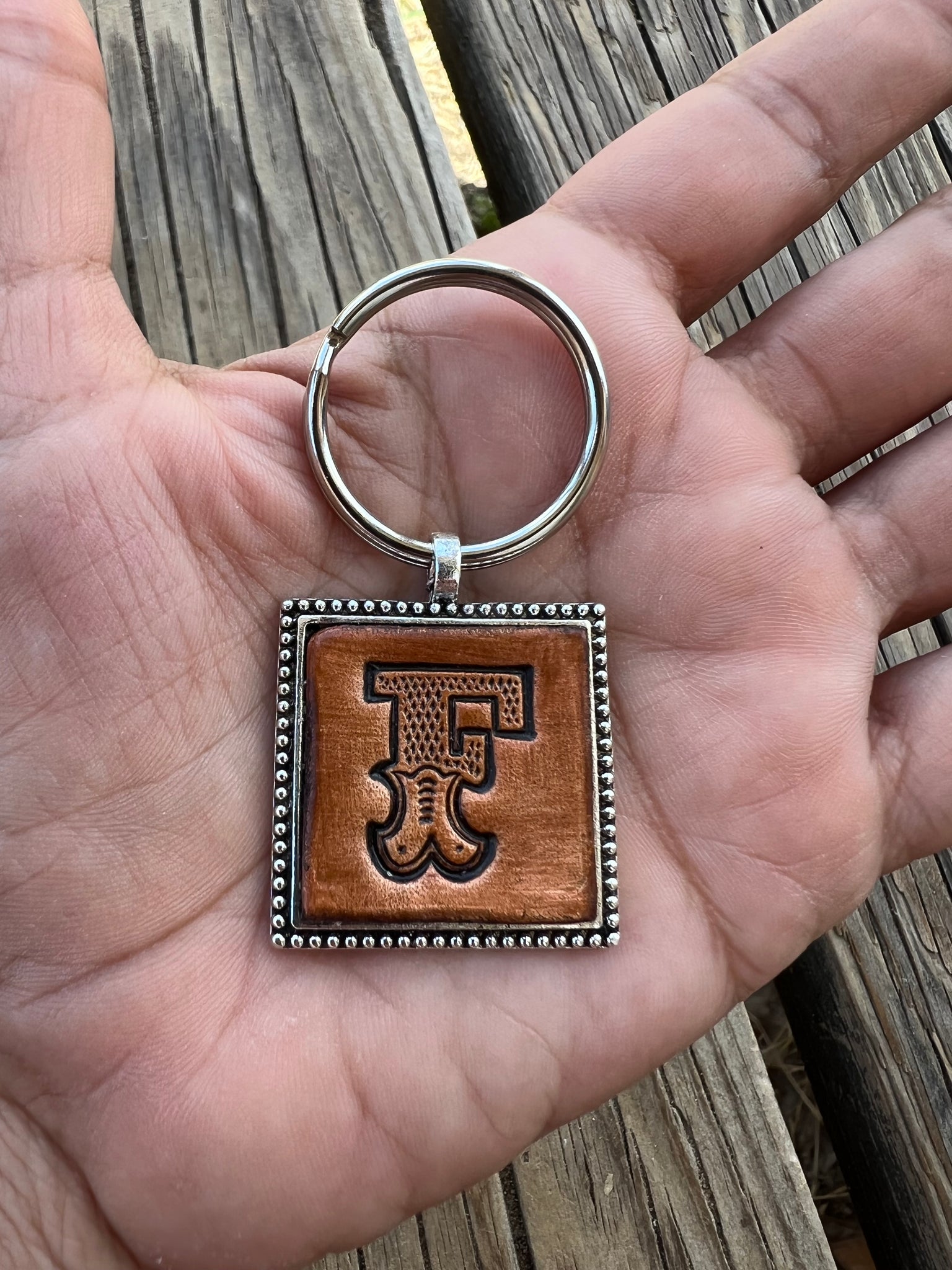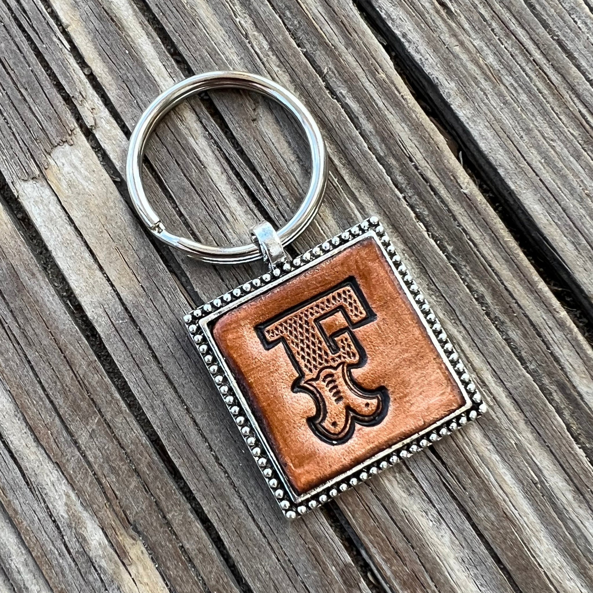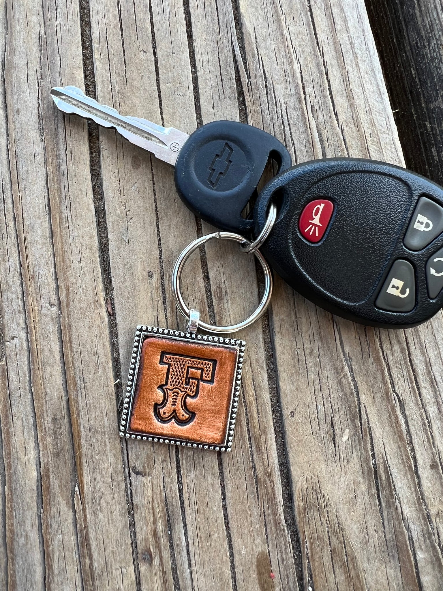 Show off your western style with a personalized, hand stamped initial key chain in real cowhide leather.