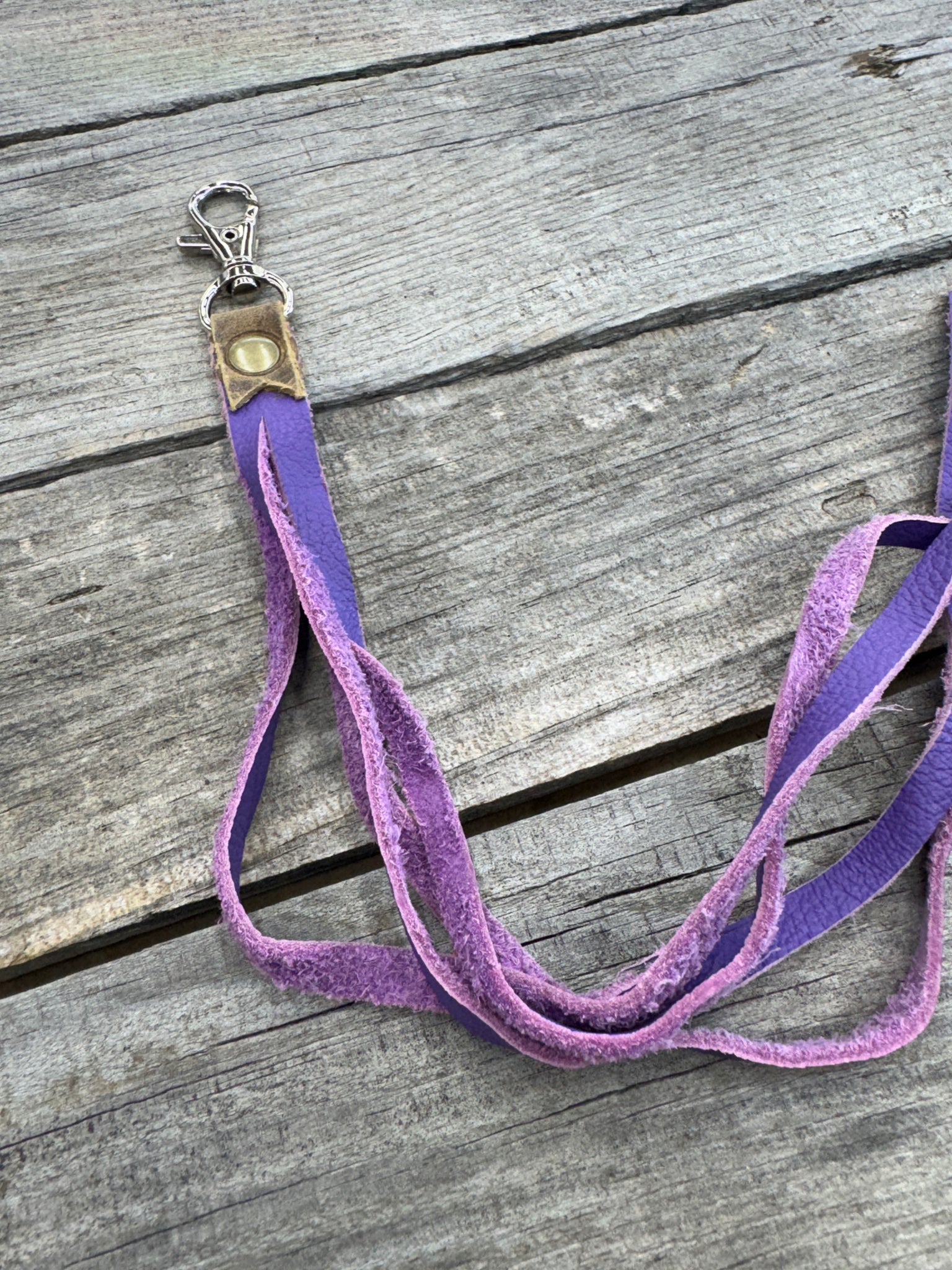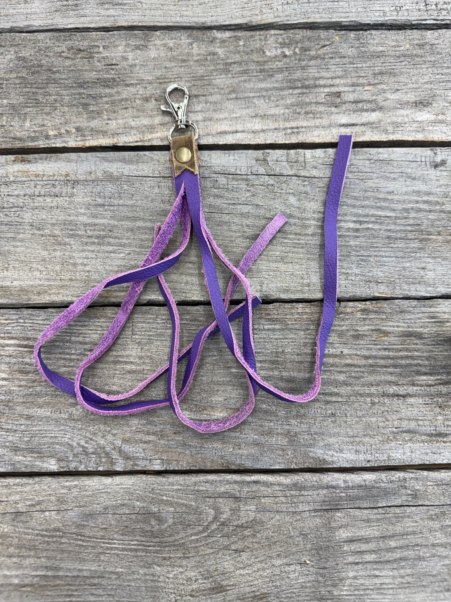 Each tassel is hand cut from soft pigskin suede in a rich purple hue that adds just the right touch of personality and texture. It’s topped with rustic brown oil-tanned leather and finished with a fancy nickel snap clip for easy attachment to purses, totes, or keyrings.