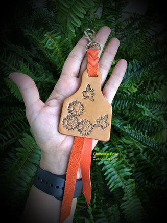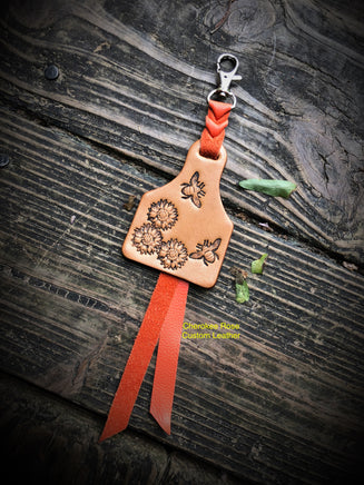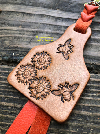 Highly detailed, hand stamped leather key chain in a cow ear tag shape. Stamped design includes bees and sunflowers. The design was then antiqued with a darker color to really allow the stamped design to stand out.