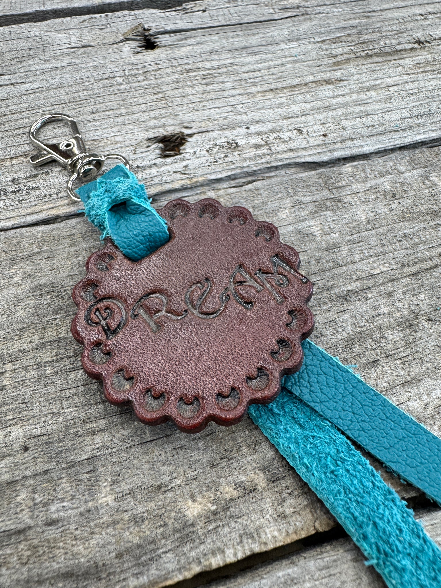 1. Dream – Hand-stamped lettering “Dream” with turquoise strap; overall length 8”