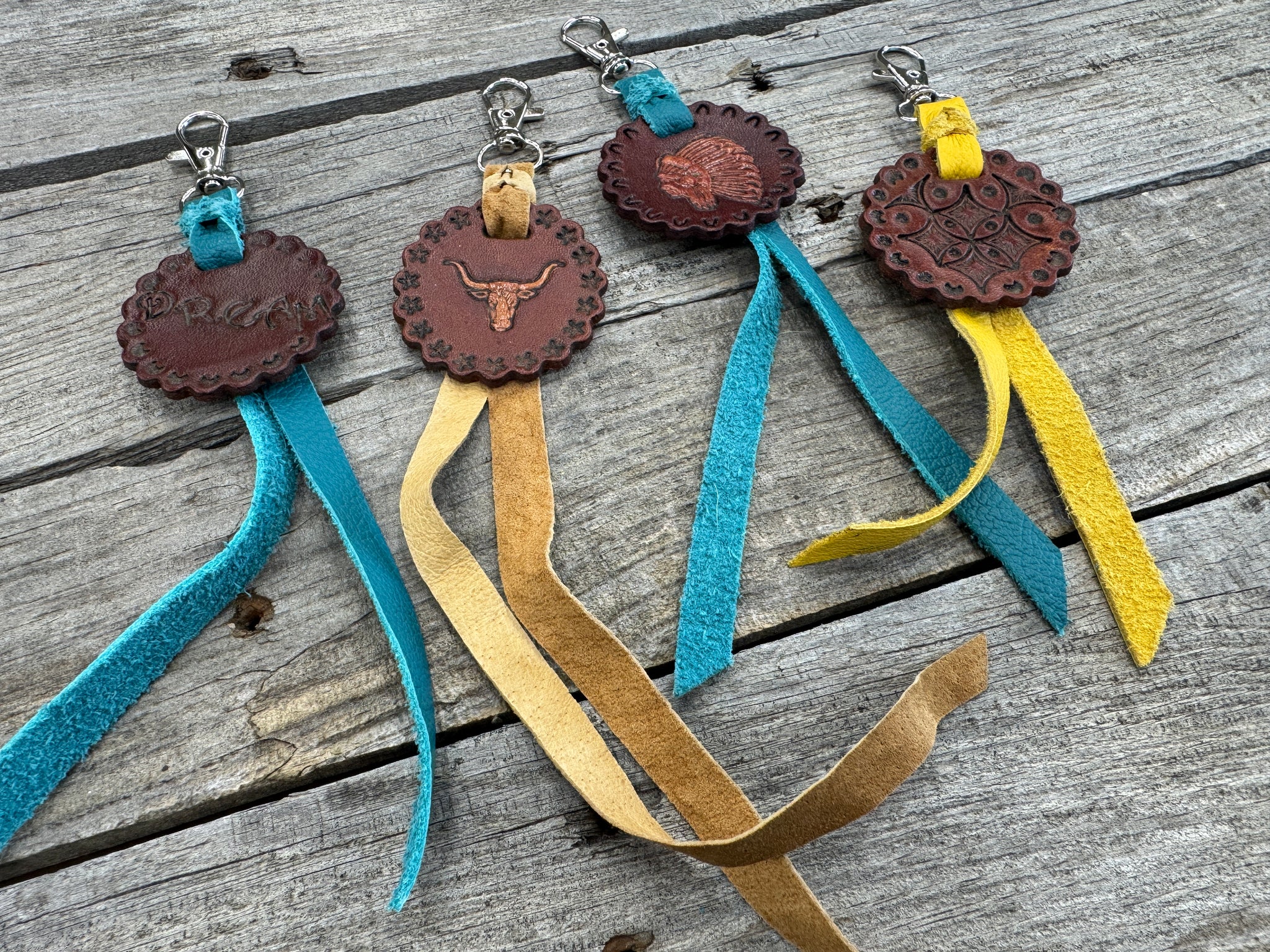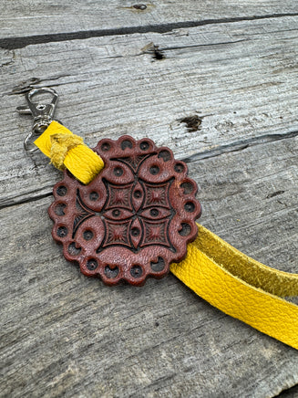 Add a touch of rustic Western charm to your purse, bag, or keyring with these hand-stamped leather scalloped concho-style charms. Each one is hand-cut from 8/9 oz full-grain leather, stamped and dyed by hand, and finished with a colored pigskin suede strap tied in a traditional Western blood knot.