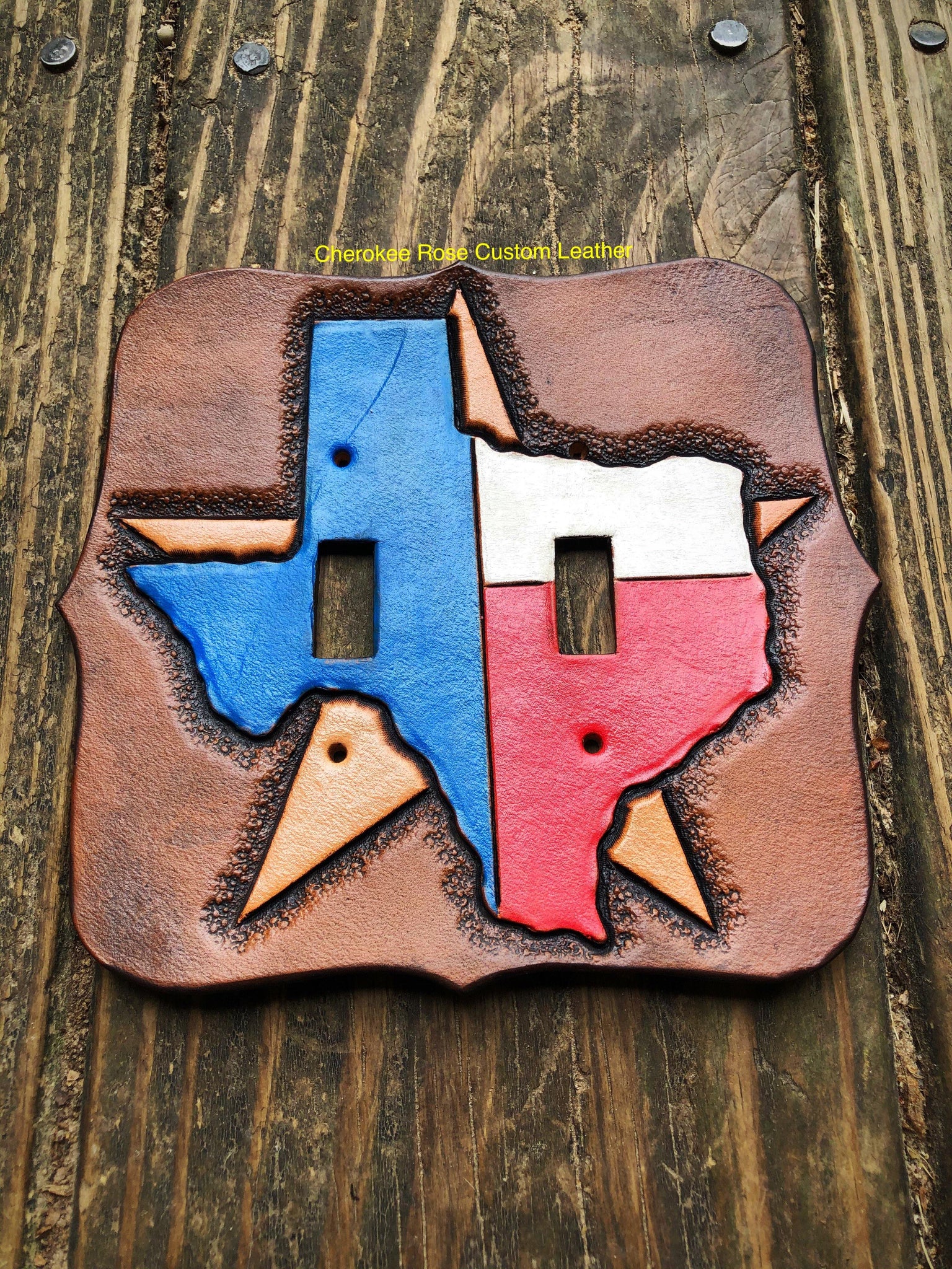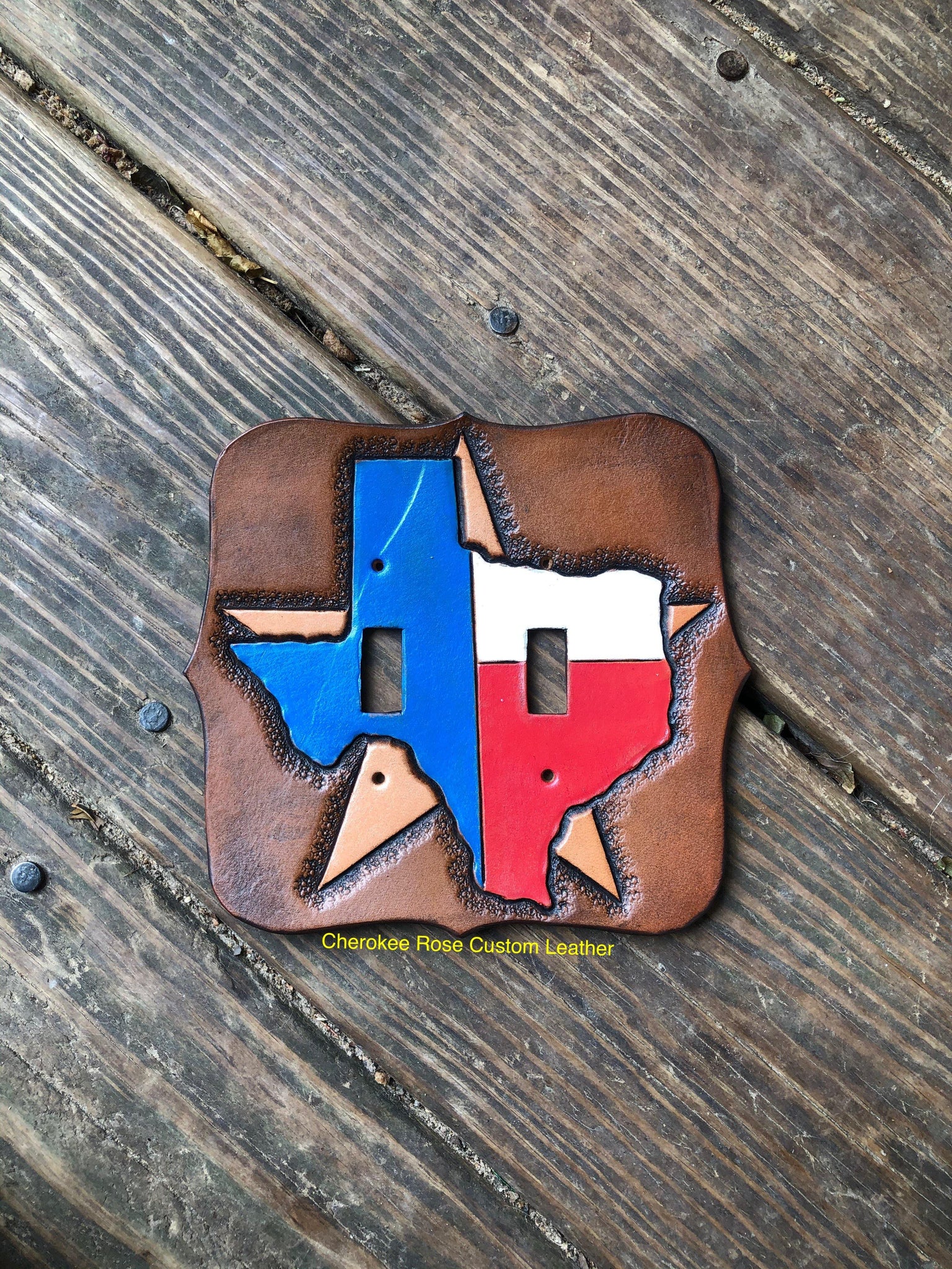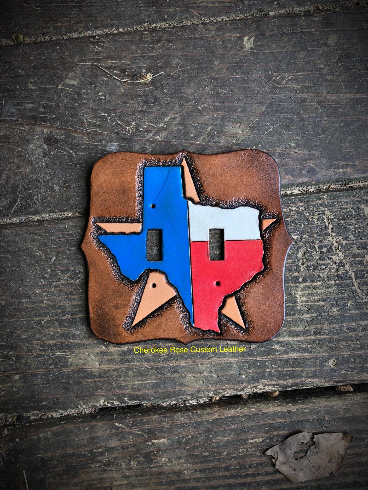 Bring some Lone-Star charm to your home with this custom-crafted double light switch cover made of real leather and hand-painted with the state of Texas as the Texas flag with a star in the background! Add a unique touch to any room and enjoy the beauty of handmade leatherwork! Yee-haw!