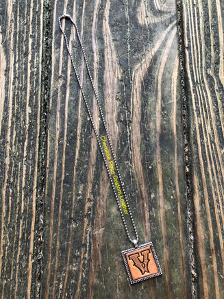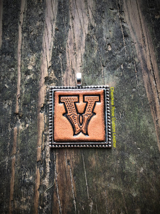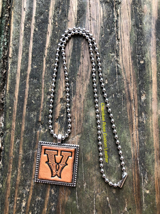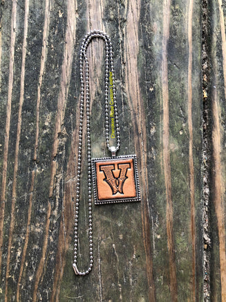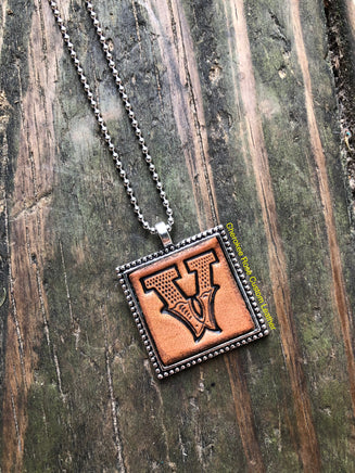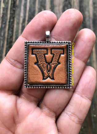 Created from hand stamped leather with the initial 'V' and then antiqued for a rustic, western look.