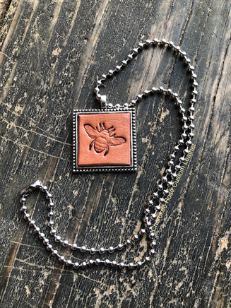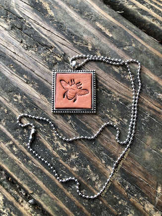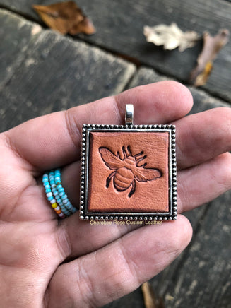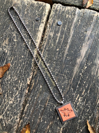 Created from hand cut leather that I then hand stamped with a sweet honey bee stamped design and then antiqued for a rustic, western look.