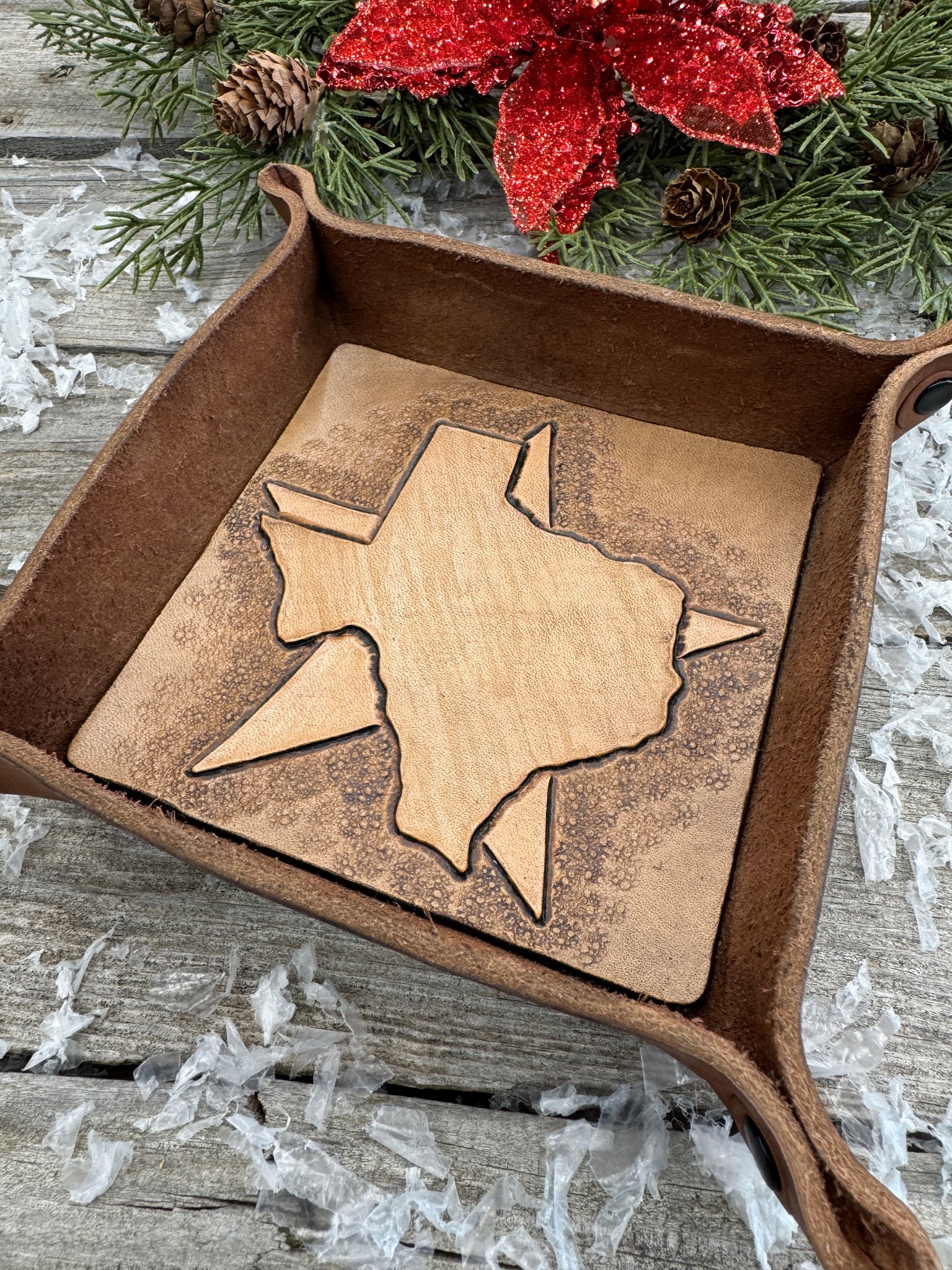 Hand-tooled leather valet tray with carved Texas state outline and Lone Star background, handmade by Cherokee Rose Custom Leather in Texas.