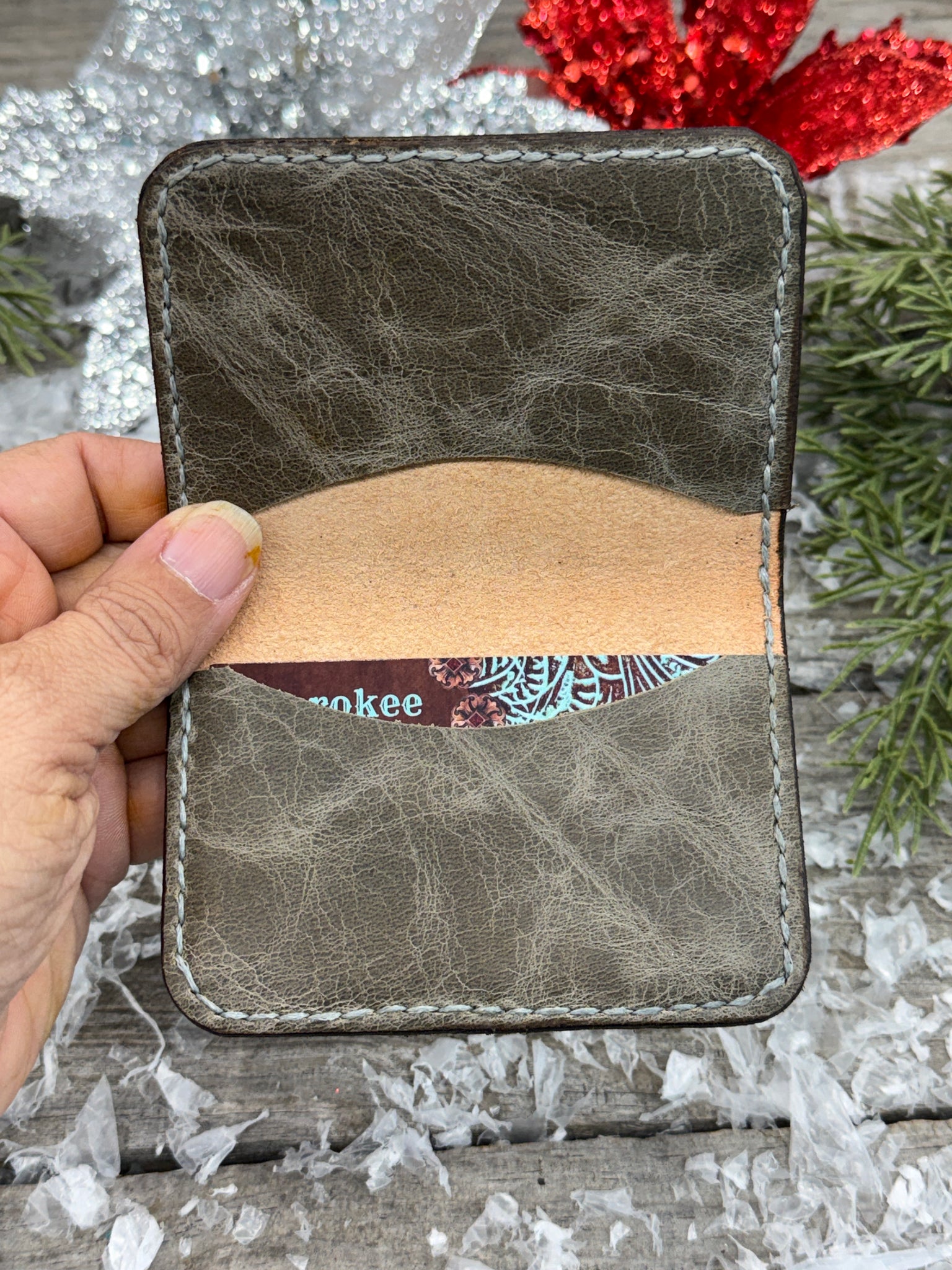 Hand-stitched in gray waxed thread, this wallet is compact enough to slip into any pocket while still offering heirloom-level craftsmanship.