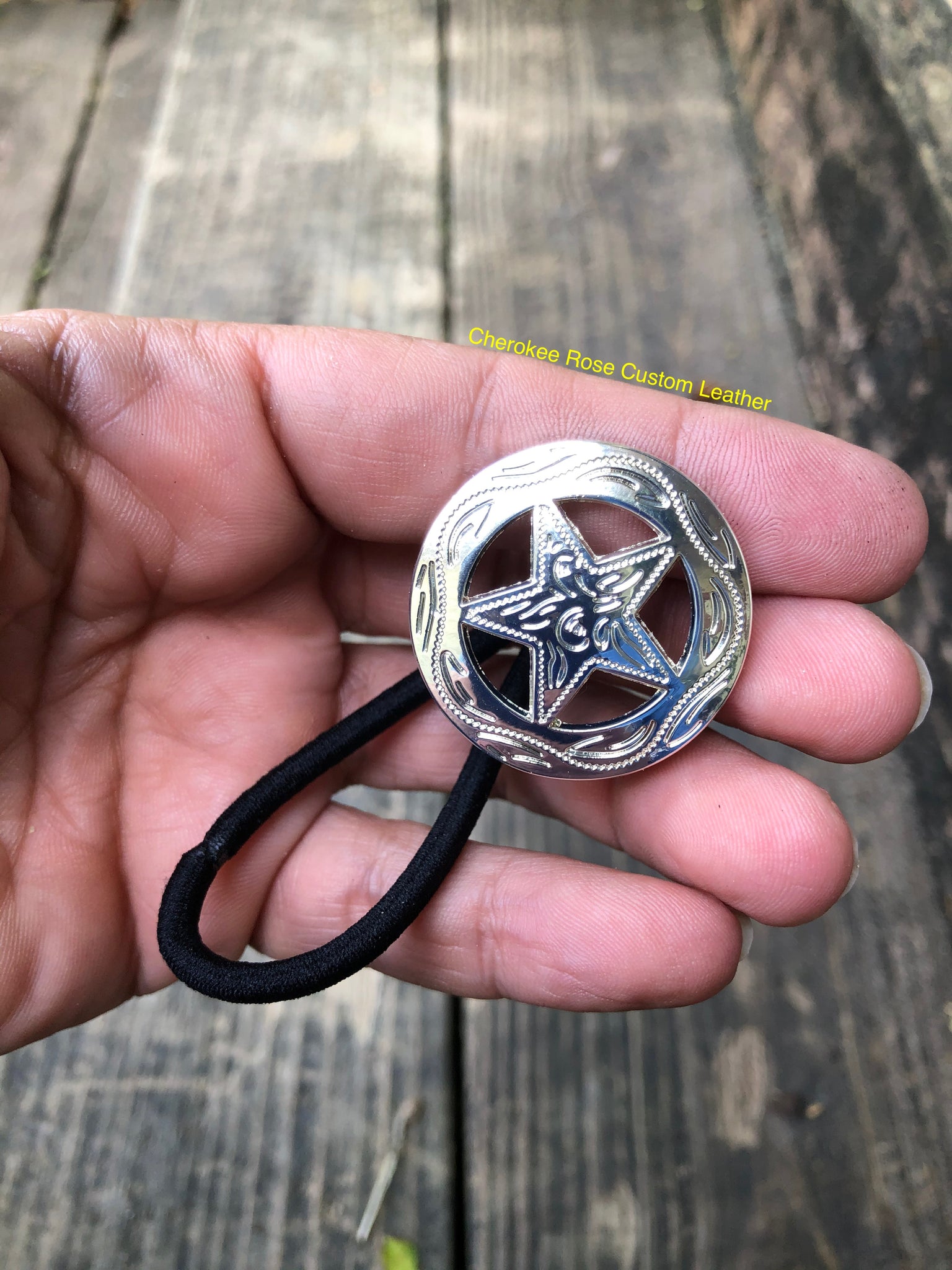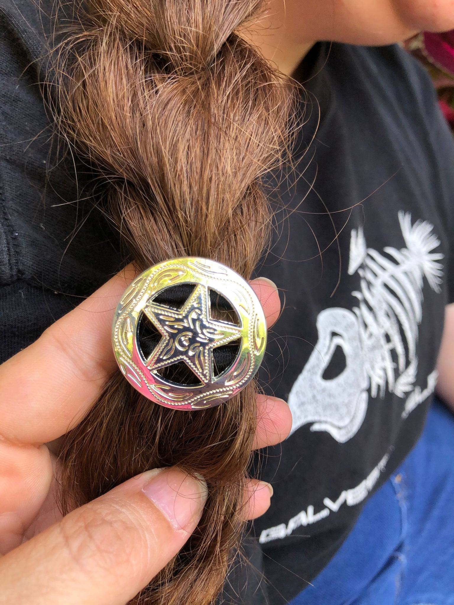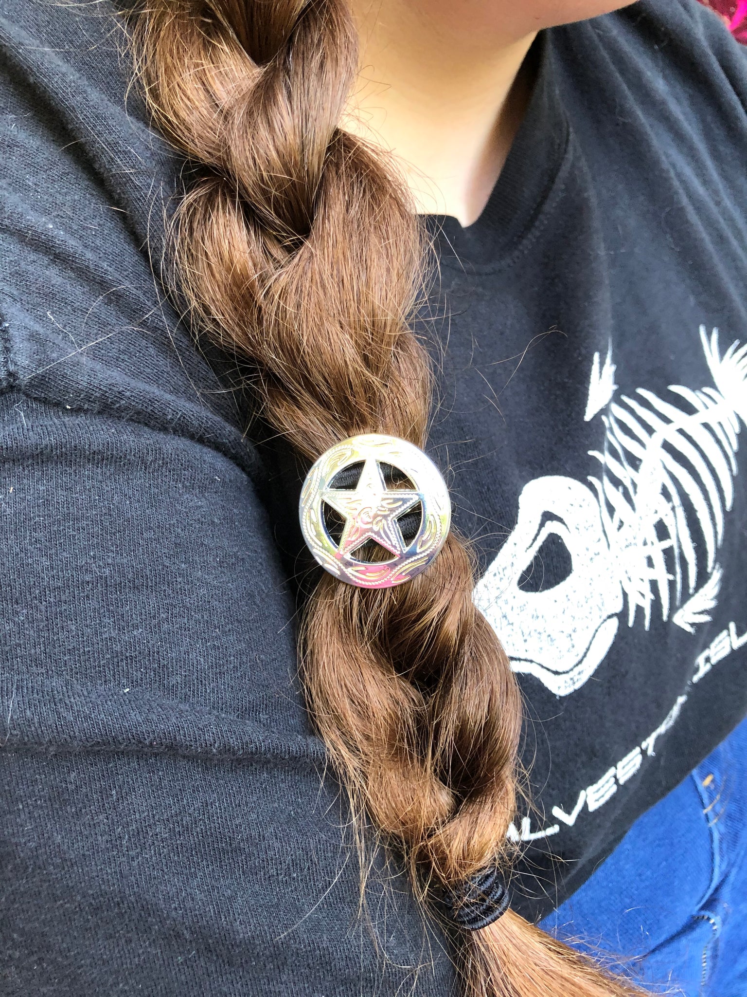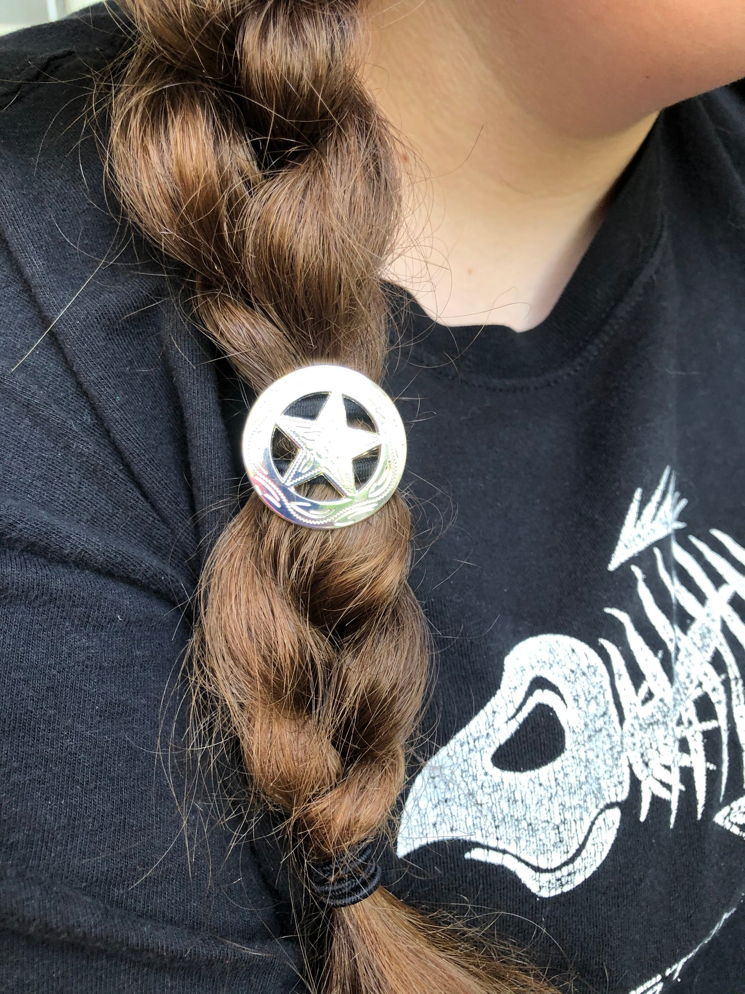 Show some bling with my shiny silver finish Ranger Star hair tie! Great for braids or thick hair.