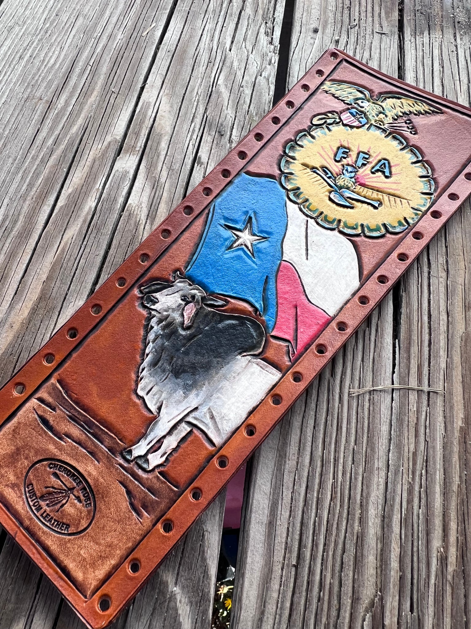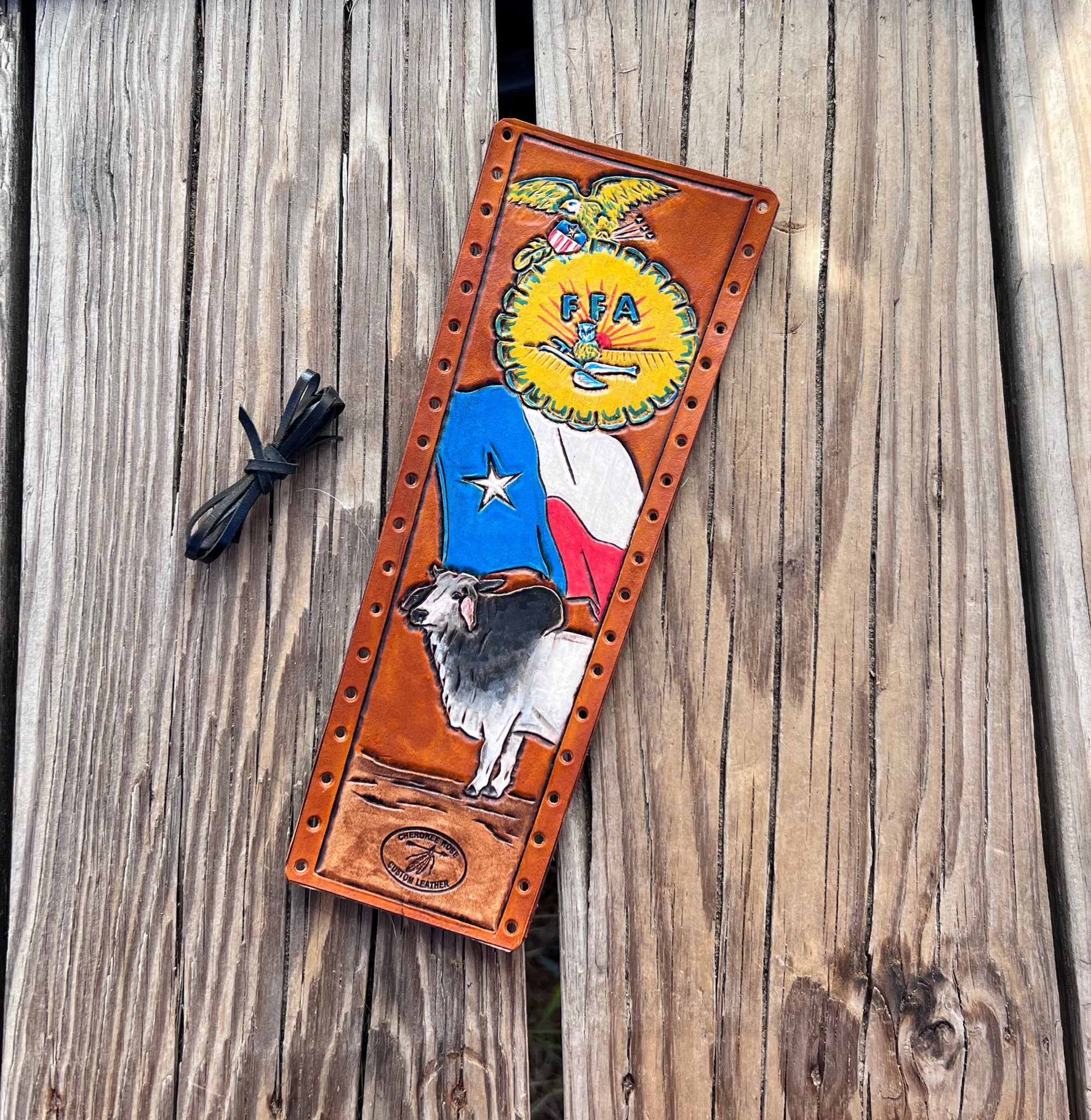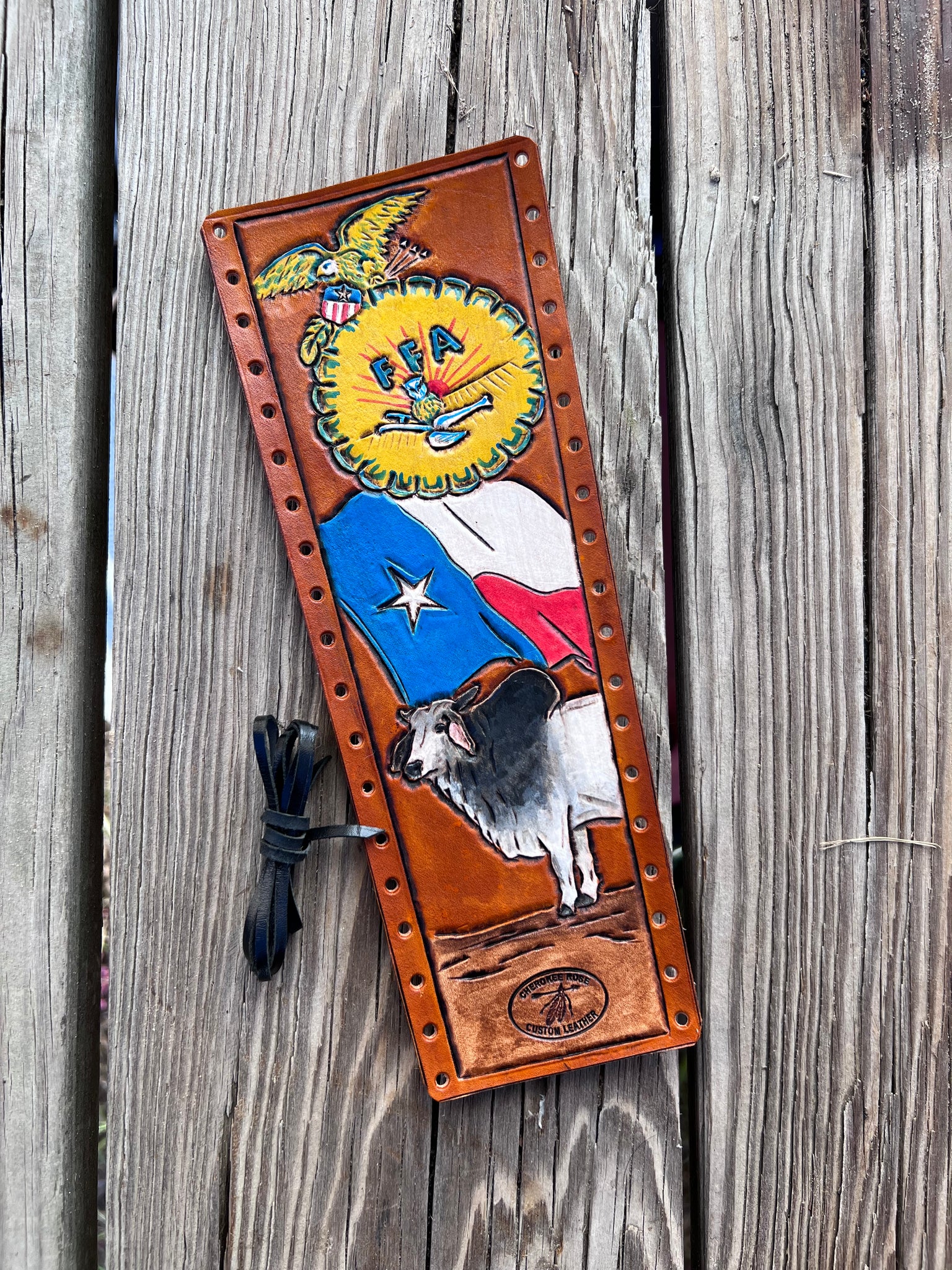 Add a touch of true Texas pride to your show stick with this unique hand-painted wrap featuring a brahman bull and the classic Texas flag! This unique wrap is made with real cowhide leather and is sure to make a splash in the show pen.