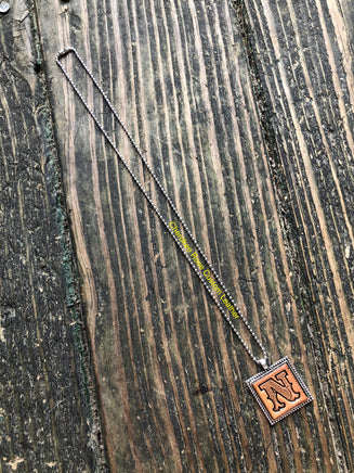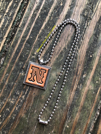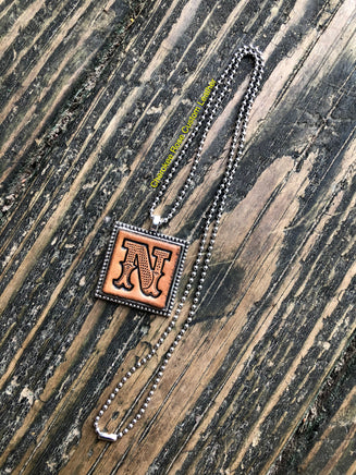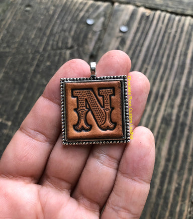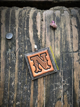Created from hand stamped leather with the initial 'N' and then antiqued for a rustic, western look.